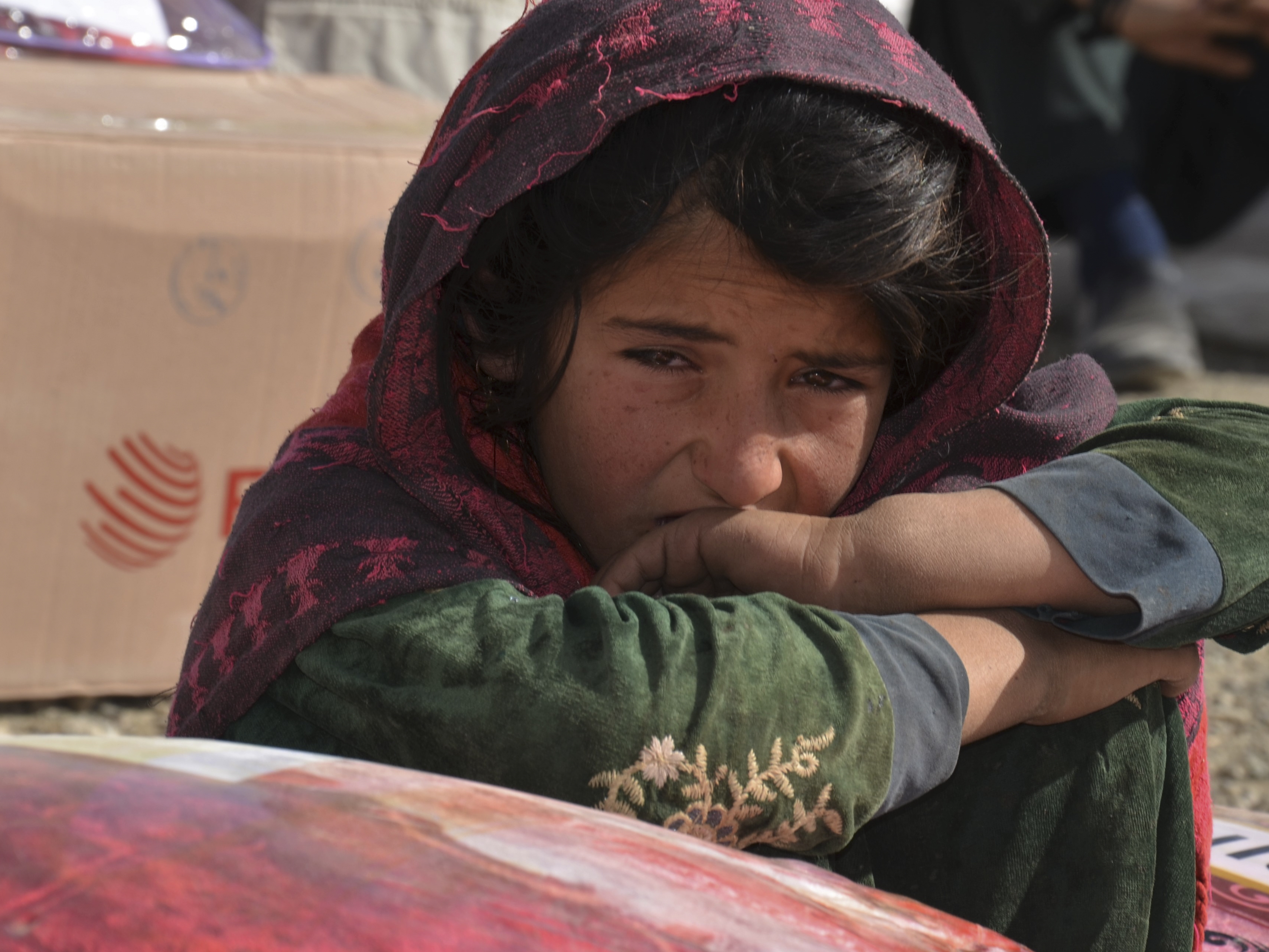 11月9日,在阿富汗霍斯特省,一名女孩坐在援助物资旁。