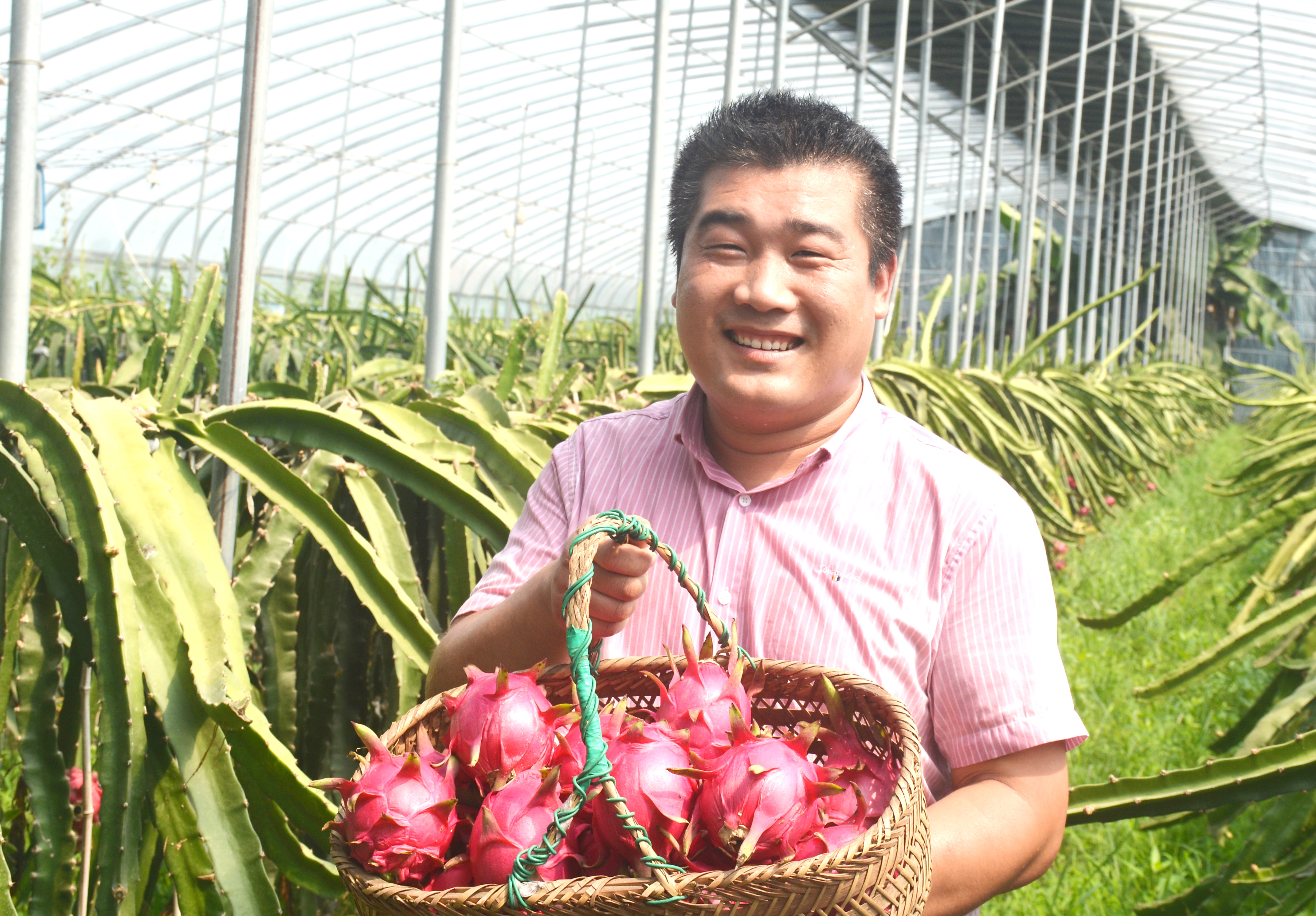 8月4日,在台儿庄区邳庄镇小李庄村的火龙果大棚里,村民朱善福正在采摘火龙果。2018年,朱善福大学毕业返乡后,经过多方学习考察,从广西引种了红心火龙果,在占地2亩的设施大棚里进行栽植,经过科学管理,年纯收入7万多元。今年,他在当地统战部门的帮助下,又建起了一个占地2亩的红心火龙果设施大棚,两个大棚预计年收入达15万元。 (侯成玺 摄)