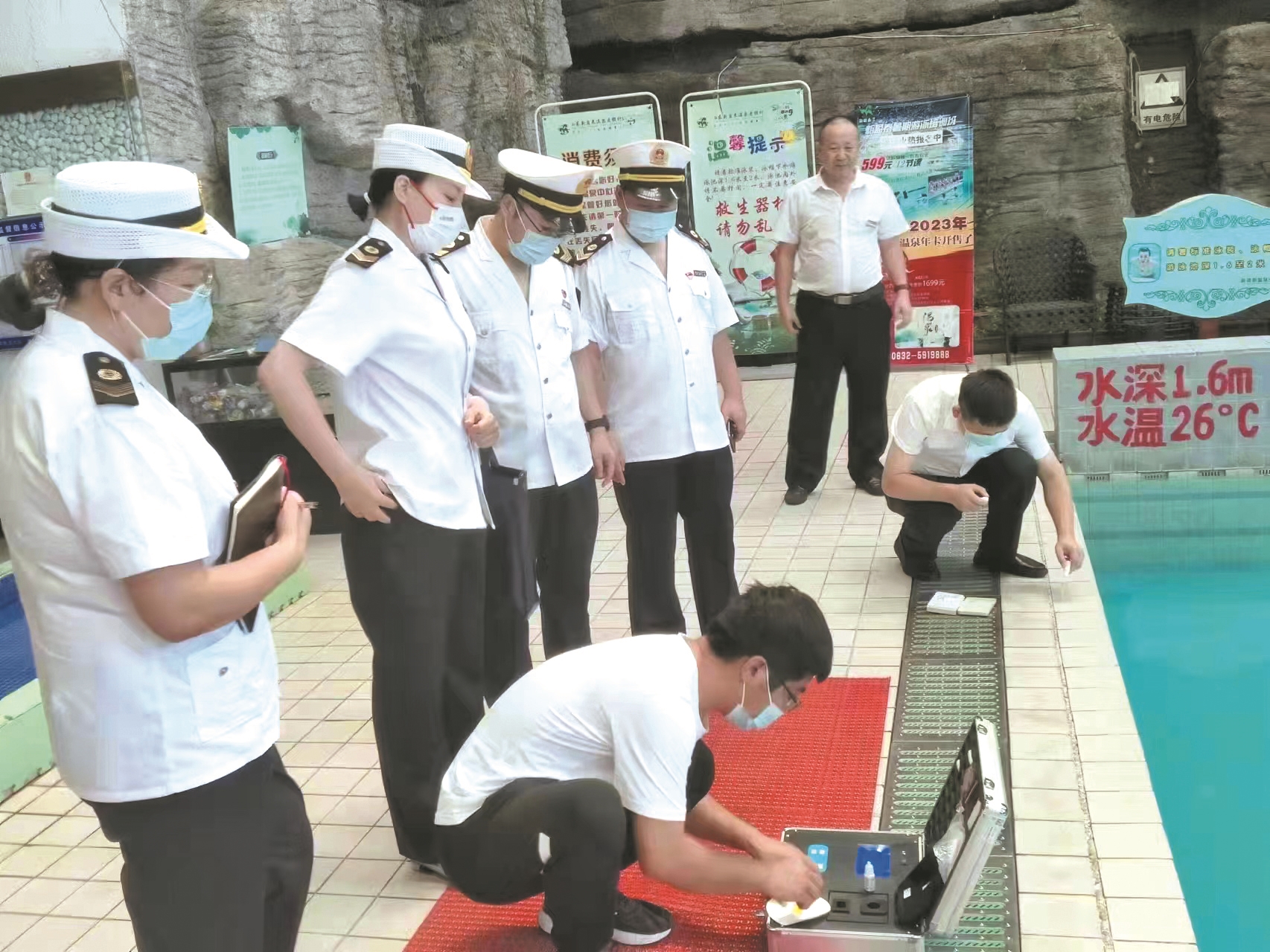 日前,滕州市卫生健康综合行政执法大队对该市15家游泳场(馆)开展了卫生专项执法检查,并联合疾病预防控制中心对游泳池水质进行了现场采样,确保游泳者的健康安全。 (杨昆 高利宏 摄)