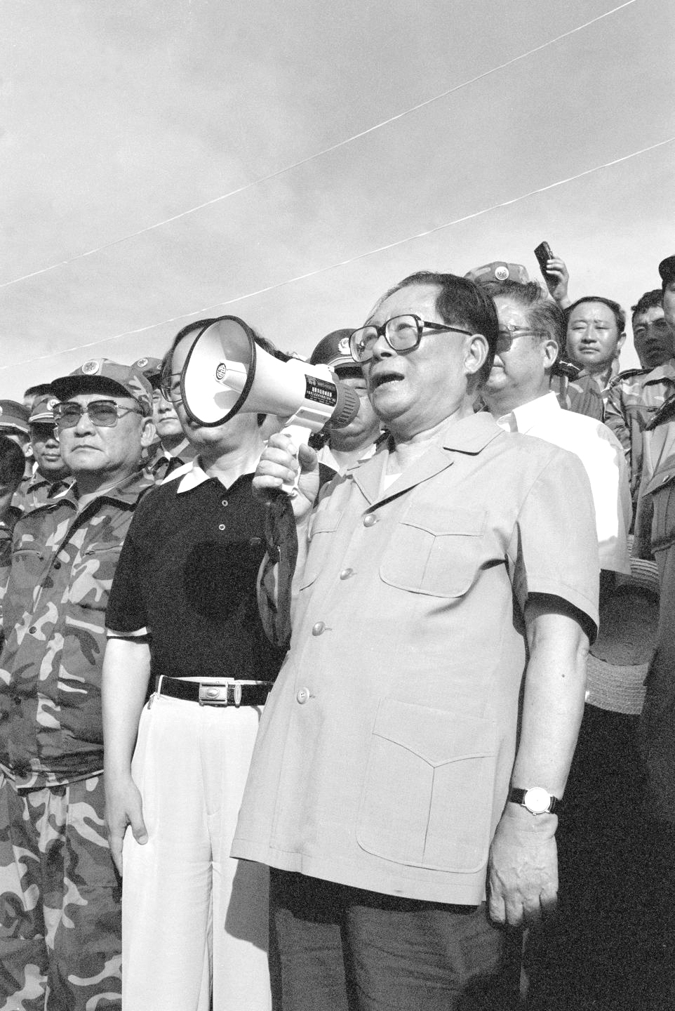 1998年8月13日至14日,江泽民同志亲赴湖北长江抗洪抢险第一线,看望、慰问、鼓励奋战在抗洪抢险第一线的广大军民,指导抗洪抢险斗争。这是8月13日江泽民同志在洪湖市乌林镇中沙角险段大堤上,向正在抗洪抢险的军民发表讲话。 (新华社发)