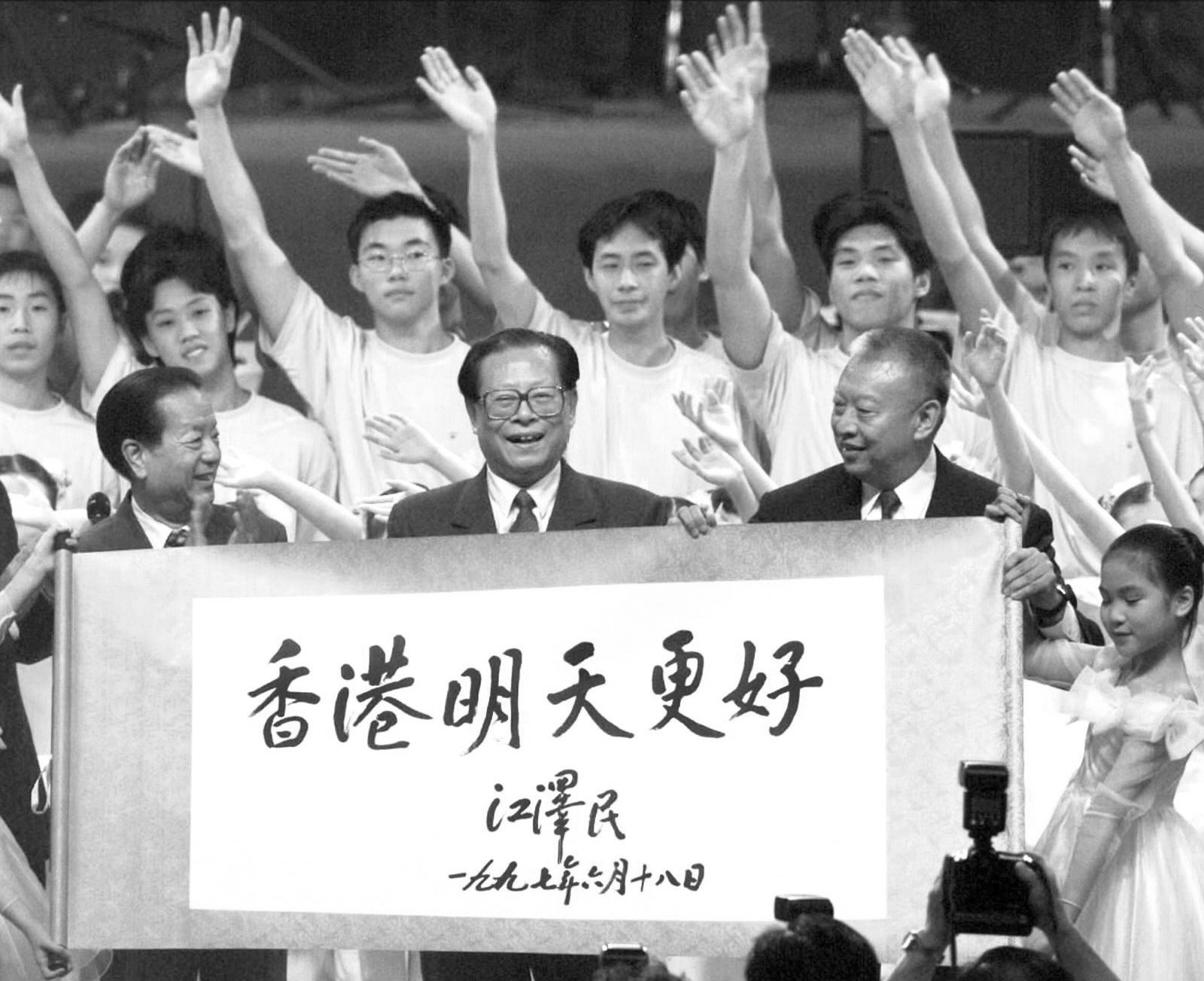 1997年7月1日上午10时,中华人民共和国香港特别行政区成立庆典在香港会展中心新翼举行。在庆典仪式上展示了江泽民同志亲手题写的“香港明天更好”书法卷轴。 (新华社发)
