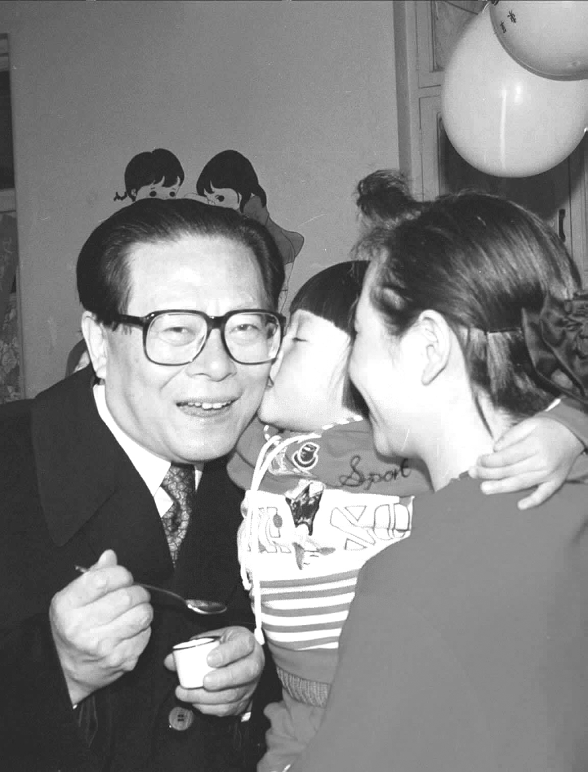 1993年12月5日,江泽民同志在北京为一位幼儿园儿童喂服脊髓灰质炎疫苗后,小朋友亲吻江爷爷。 (新华社发)