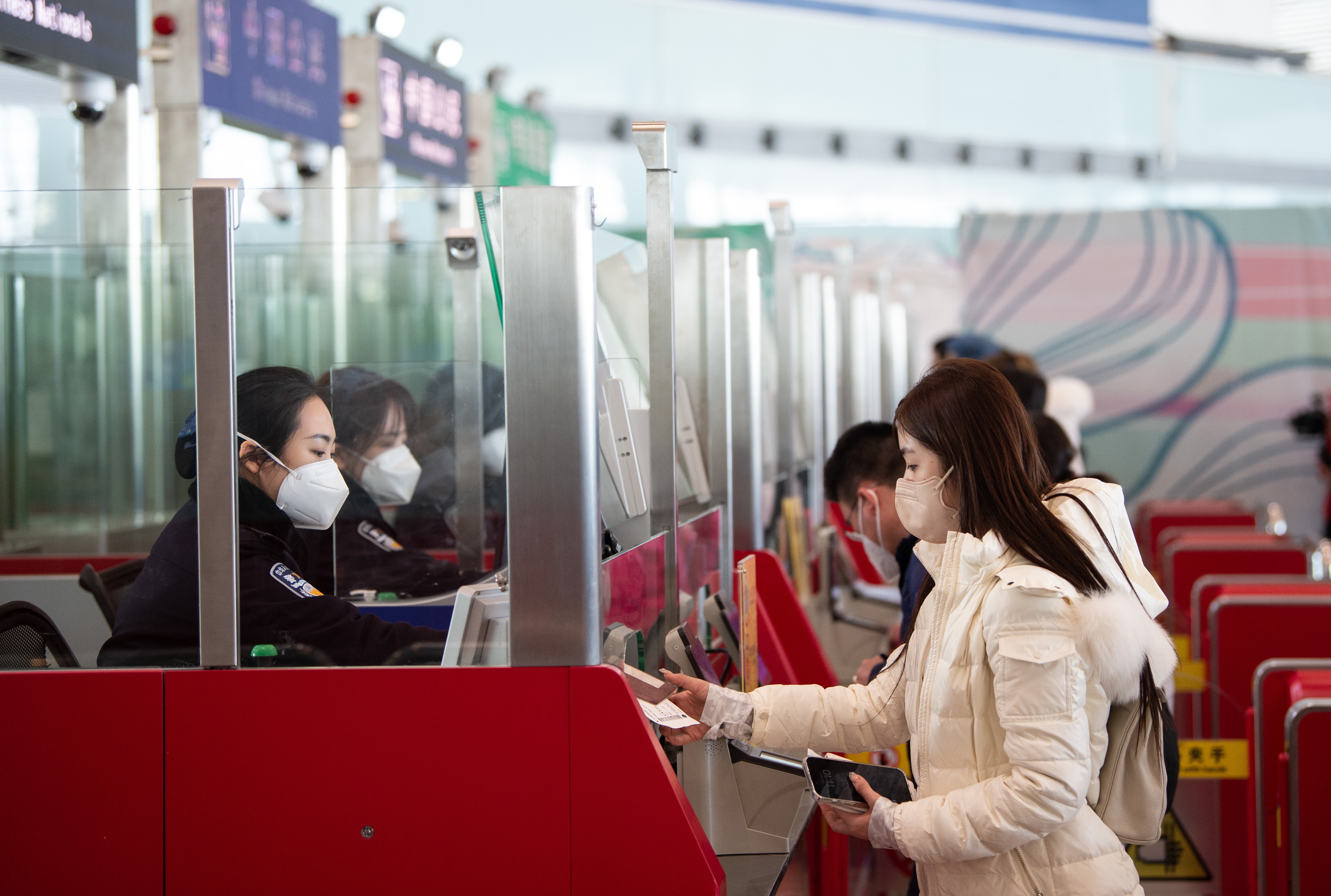 1月8日,入境旅客在首都国际机场T3-E边检查验柜台办理入境手续。