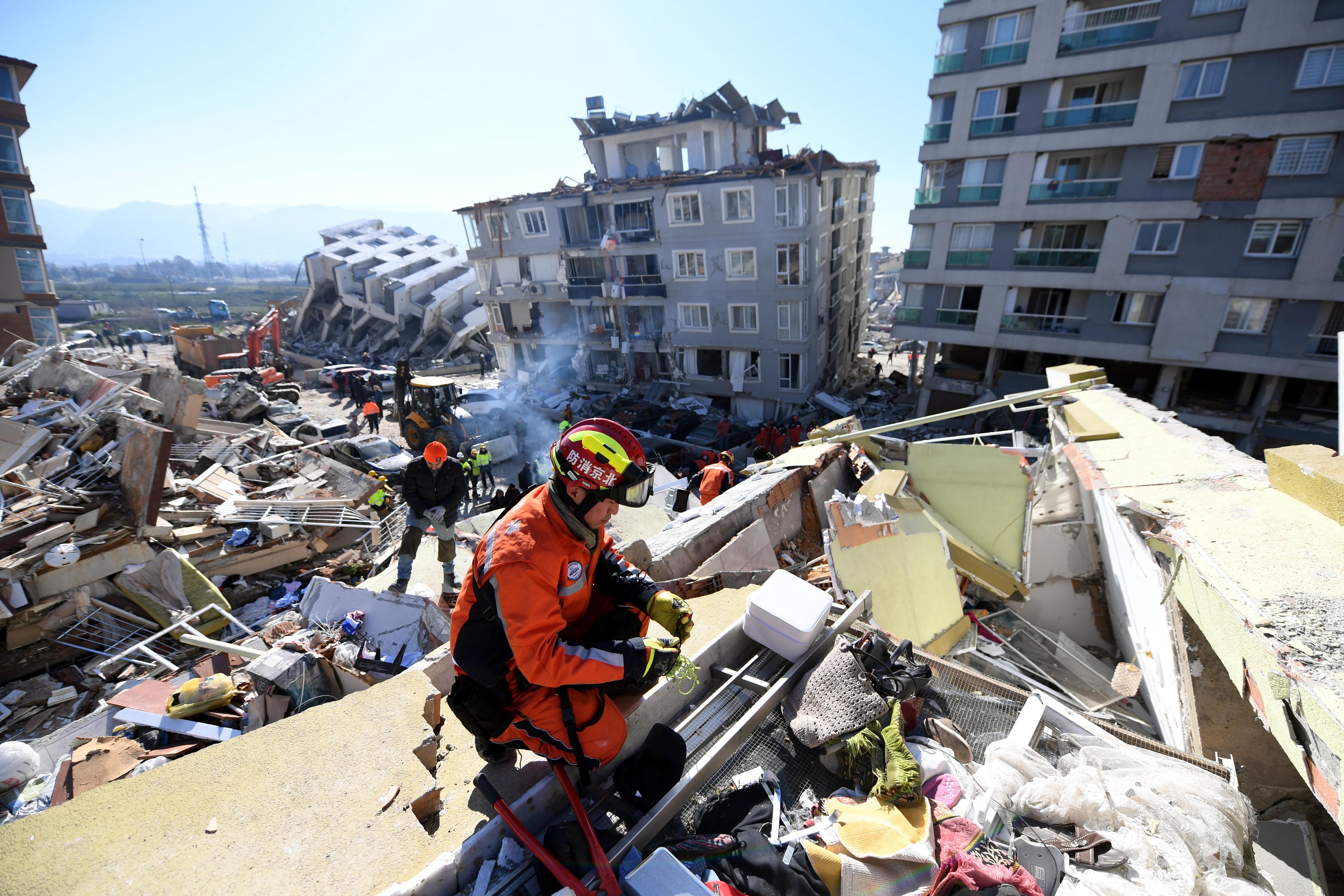 2月9日,中国救援队在土耳其哈塔伊省安塔基亚市一处受损建筑物参与地震救援工作。