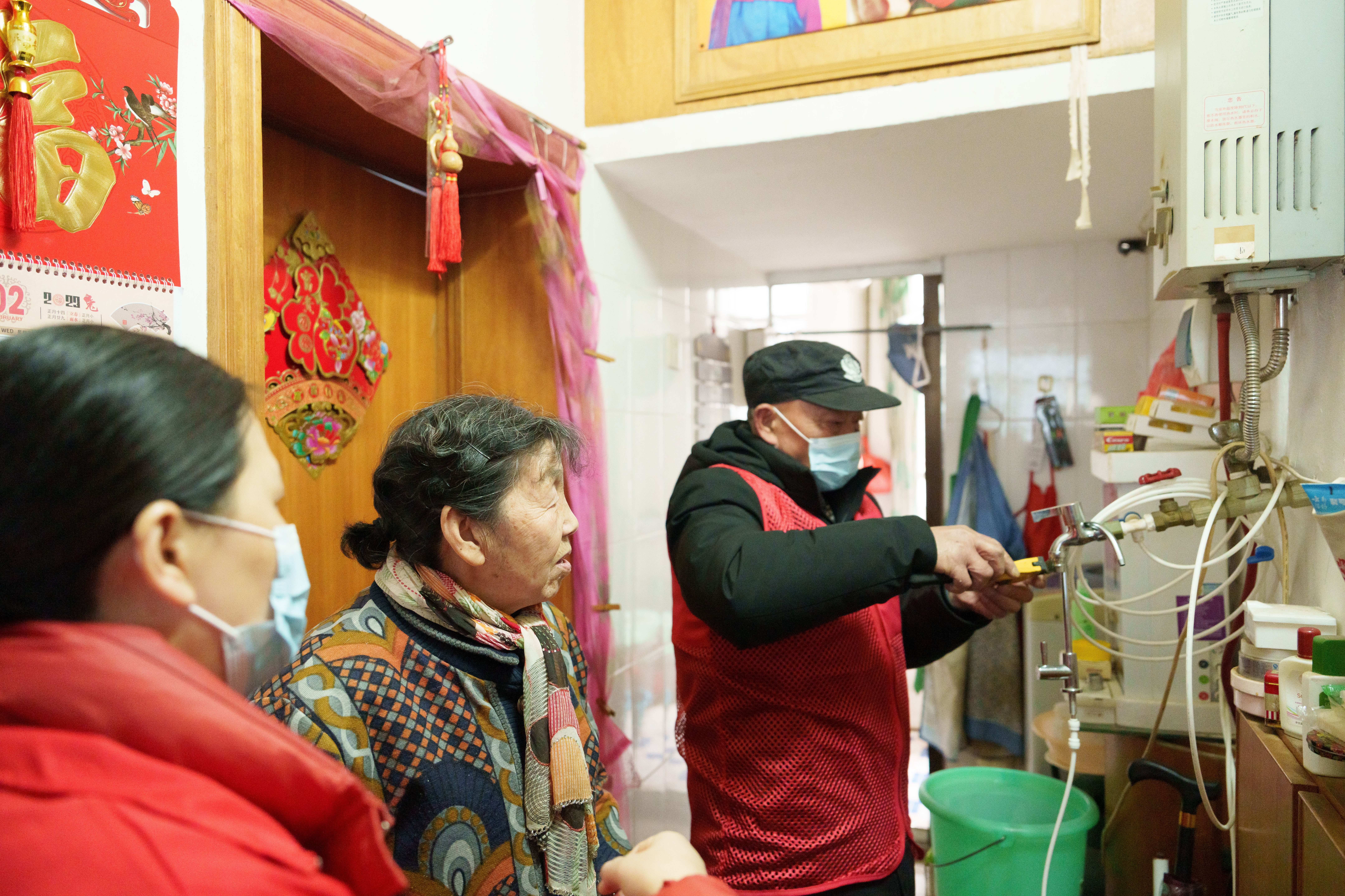 2月28日,在江西省南昌市青云谱区洪都街道洪西社区,社区工作人员在85岁的余文秀老人家中检修水管。