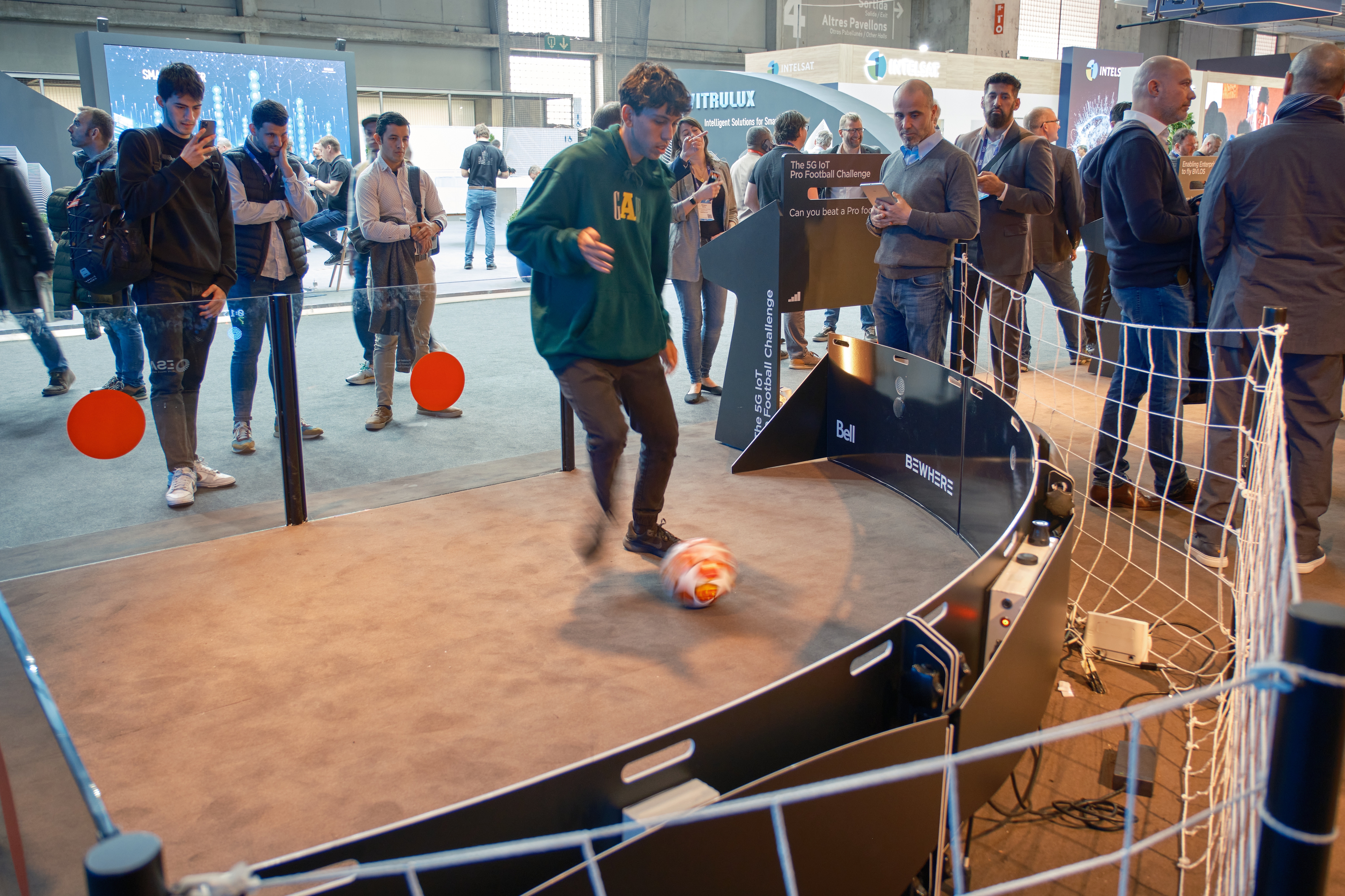 2月28日,一名男子在西班牙巴塞罗那举行的2023世界移动通信大会上体验智能足球测试设备。
