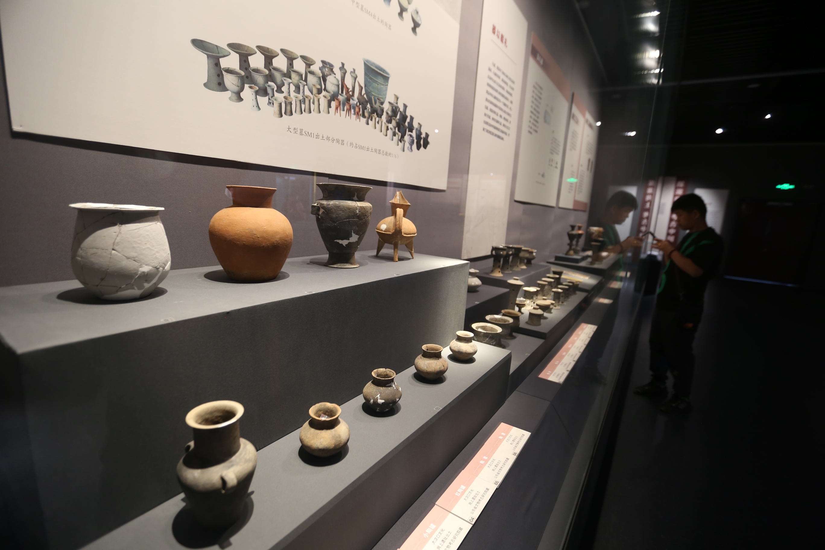 图为:市民在滕州市博物馆9号展厅观看岗上遗址遗存大口尊、骨器等。