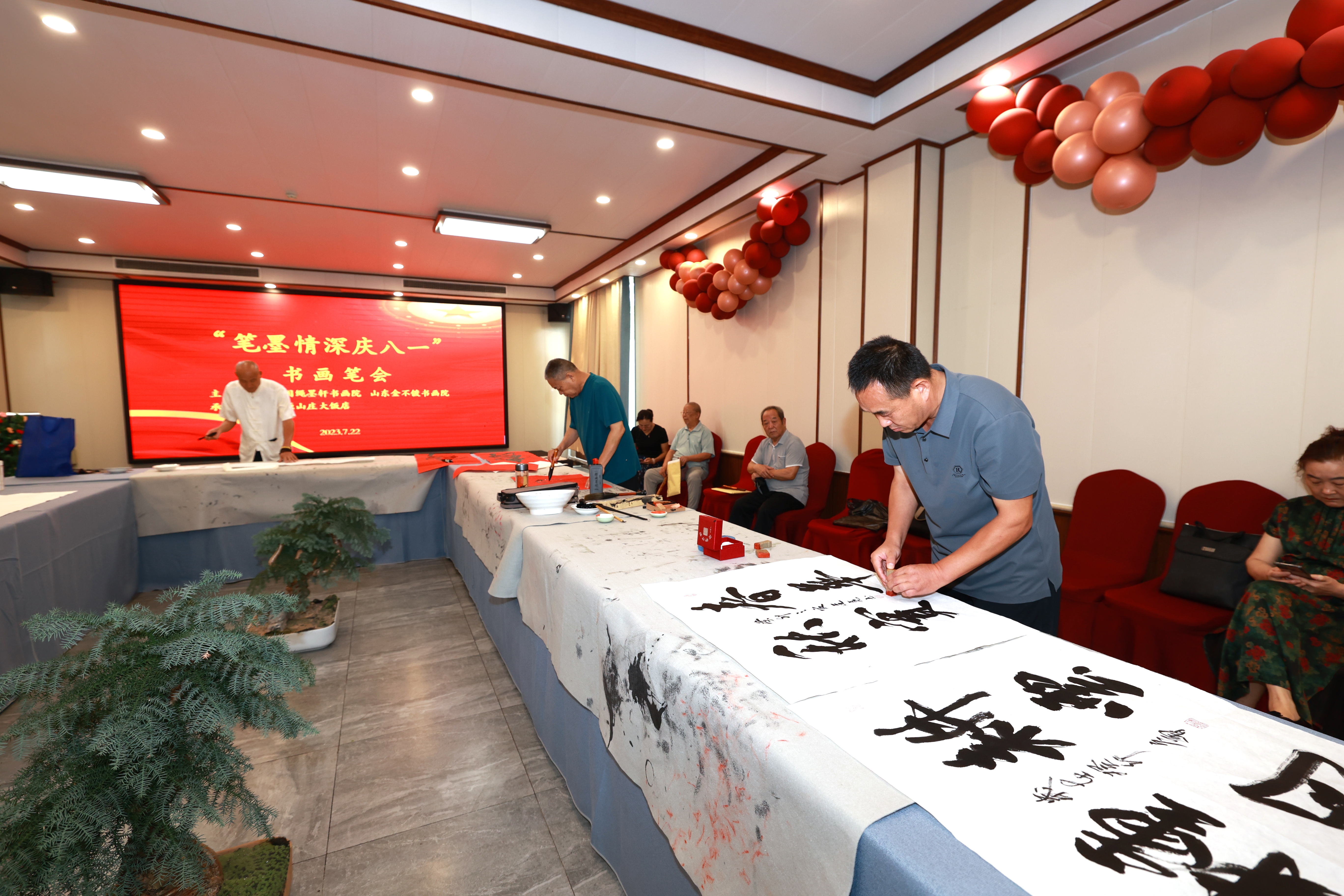 日前,由中国绳墨轩书画院、山东金不镀书画院主办,市中区退役军人事务局、市中区中心街街道商会协办的“笔墨情深庆‘八一’”庆祝中国人民解放军建军96周年书画笔会在颐源山庄举行。来自河南、江苏等地的书画家现场挥毫泼墨,用一幅幅苍劲有力、气势恢宏的书画作品表达军爱民、民拥军的鱼水深情。 (记者 王龙飞 摄)