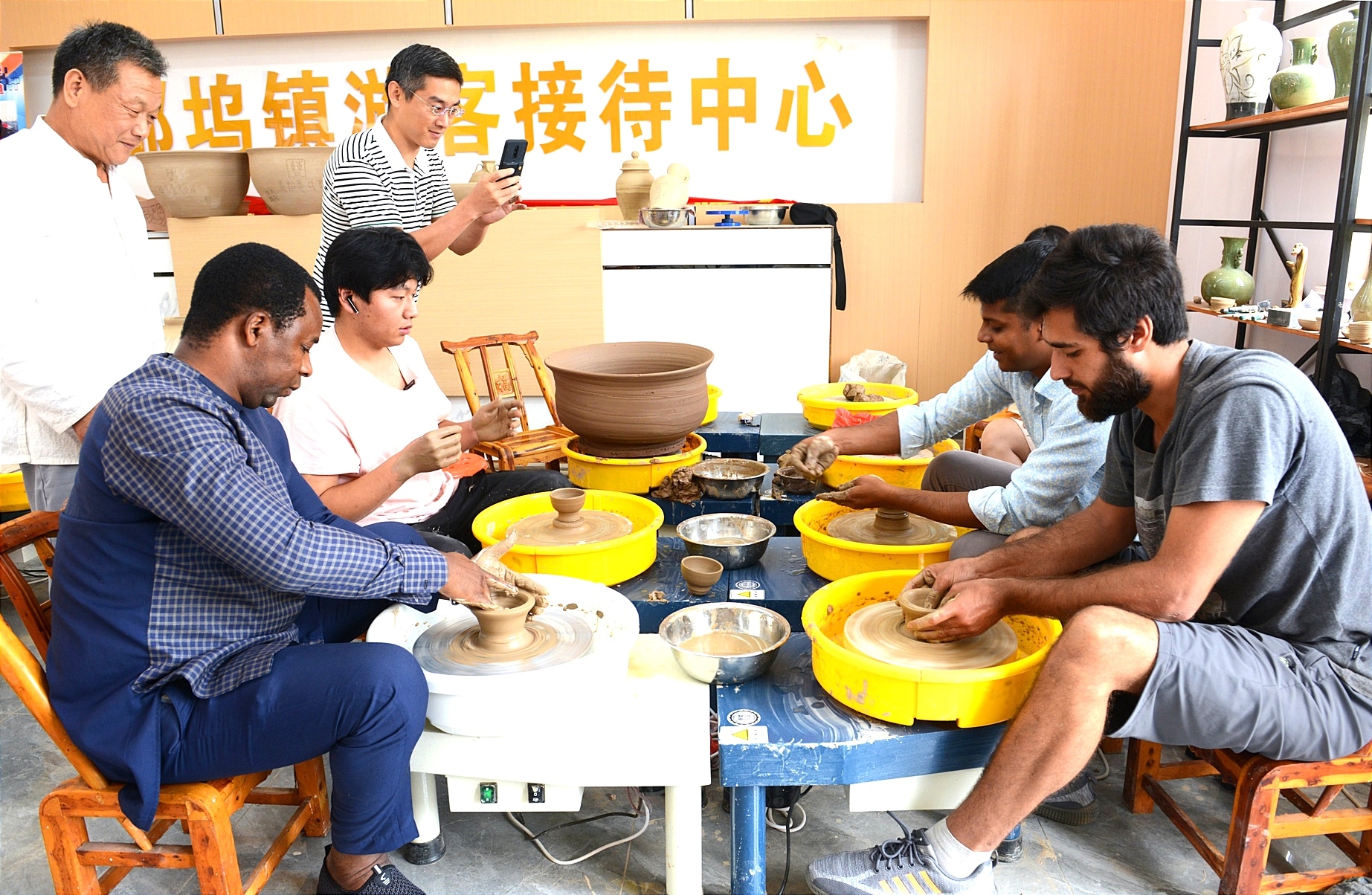 近日,在薛城区邹坞镇马氏柴烧陶瓷工作室内,三位外国友人在非物质文化遗产传承人马士常的指导下,学习中陈郝制陶拉坯技艺。