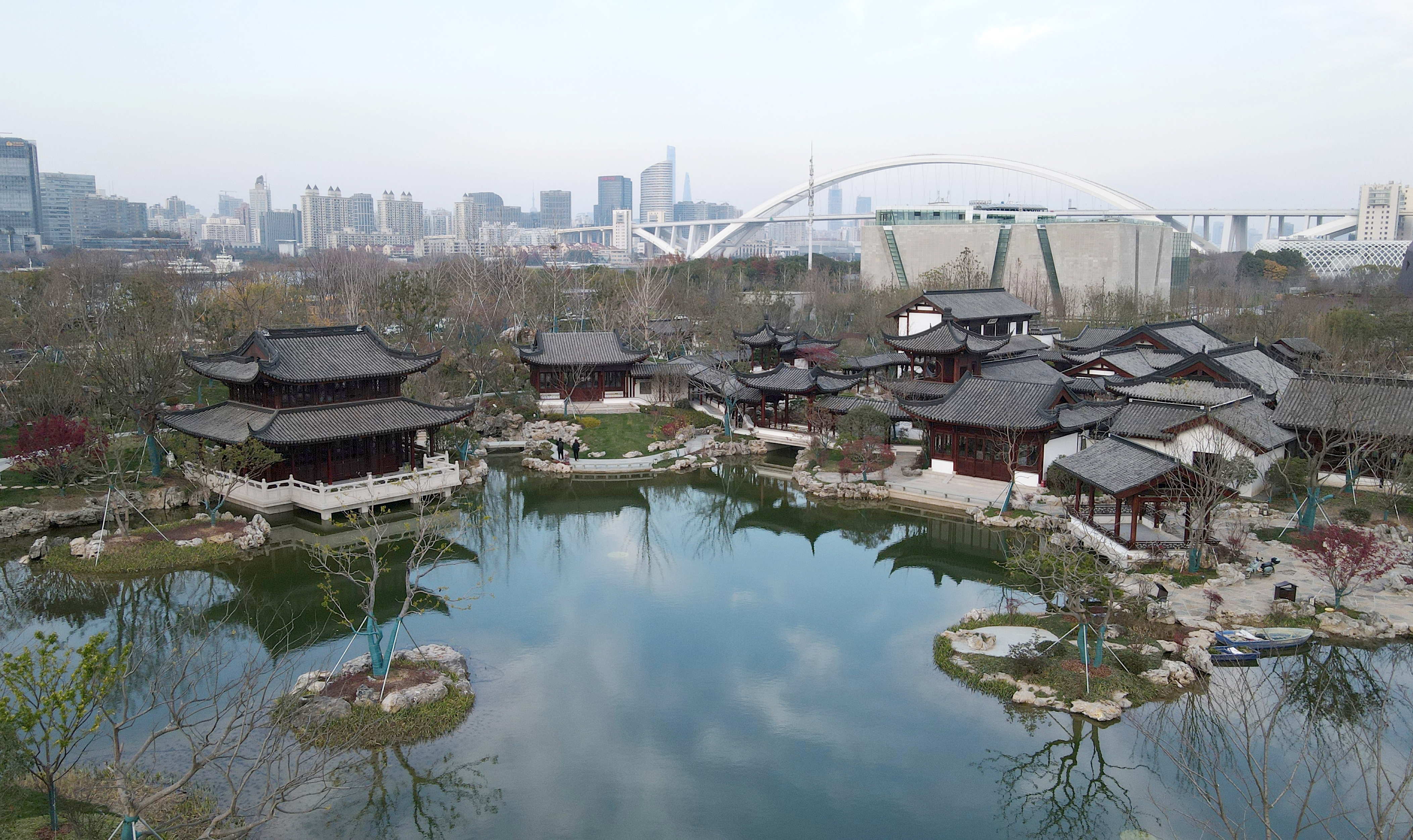 俯瞰位于浦东新区的上海世博文化公园“申园”中式园林(2021年12月20日摄,无人机照片)。