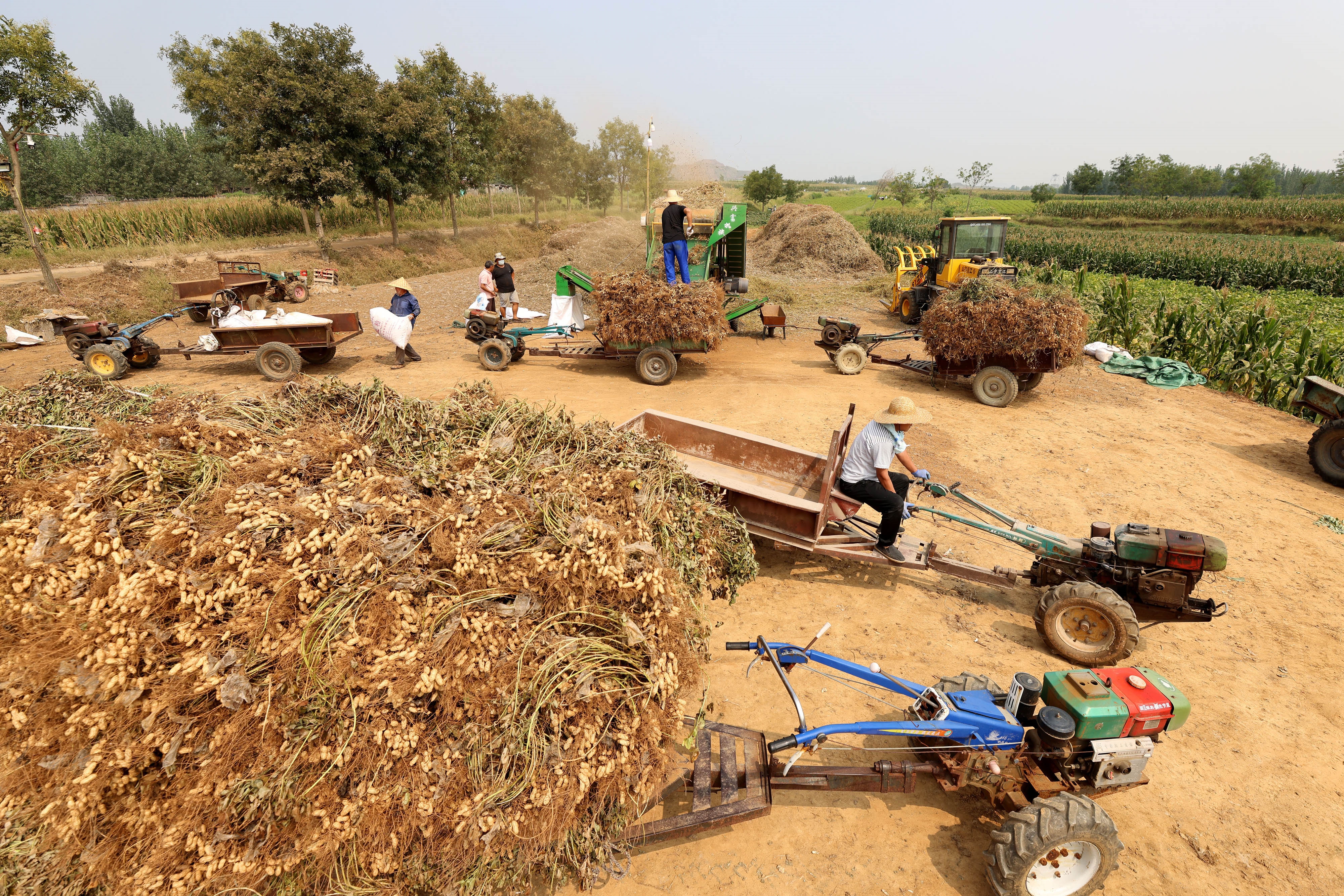 图为9月3日,在市中区税郭镇桃园村,农民在利用农业机械加工收获的花生。 (吉喆 摄)