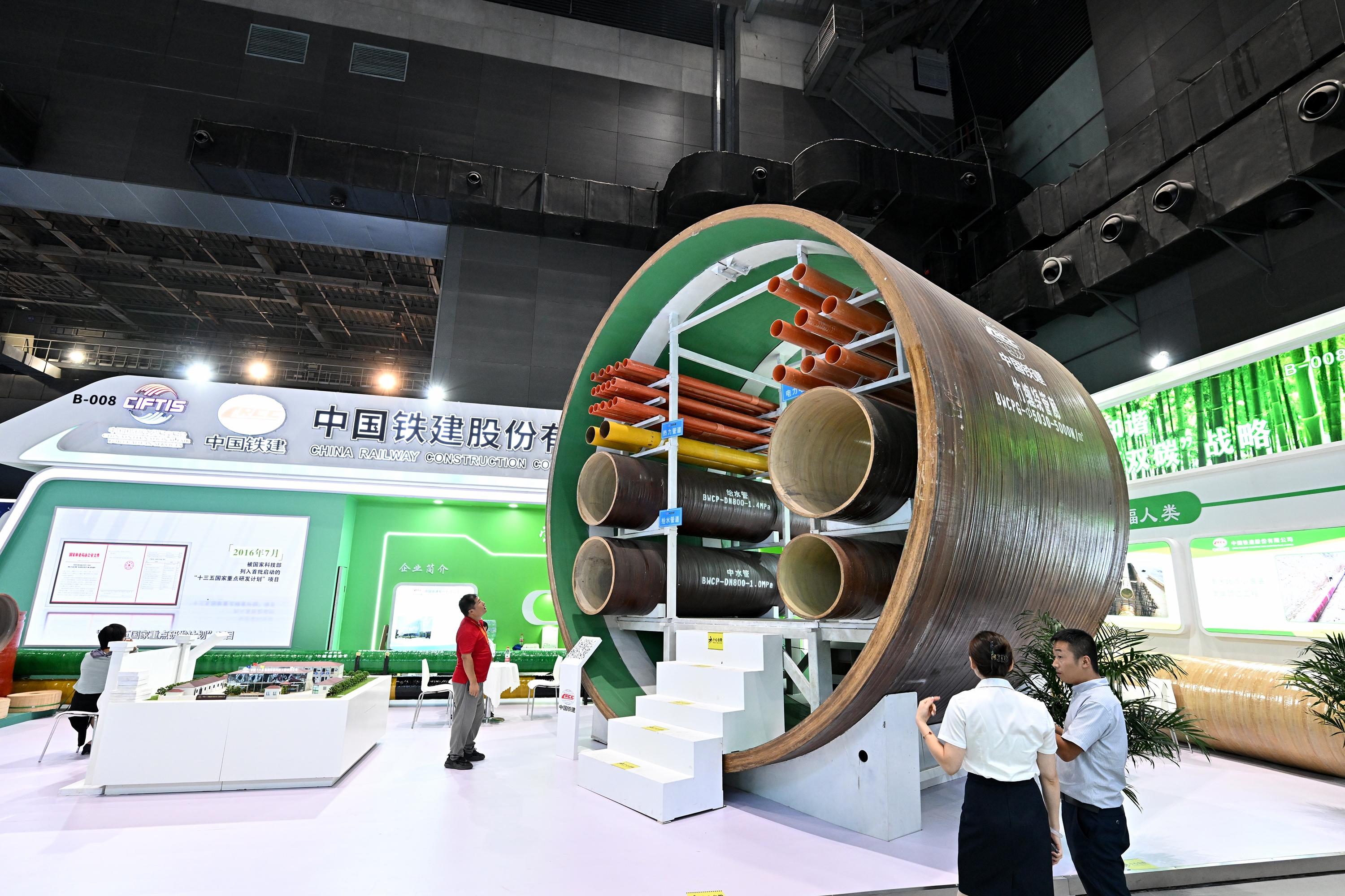 9月2日,在国家体育馆举行的服贸会环境服务专题展上,客商在中国铁建展位竹缠绕管廊旁了解信息。(新华社记者 李鑫 摄)