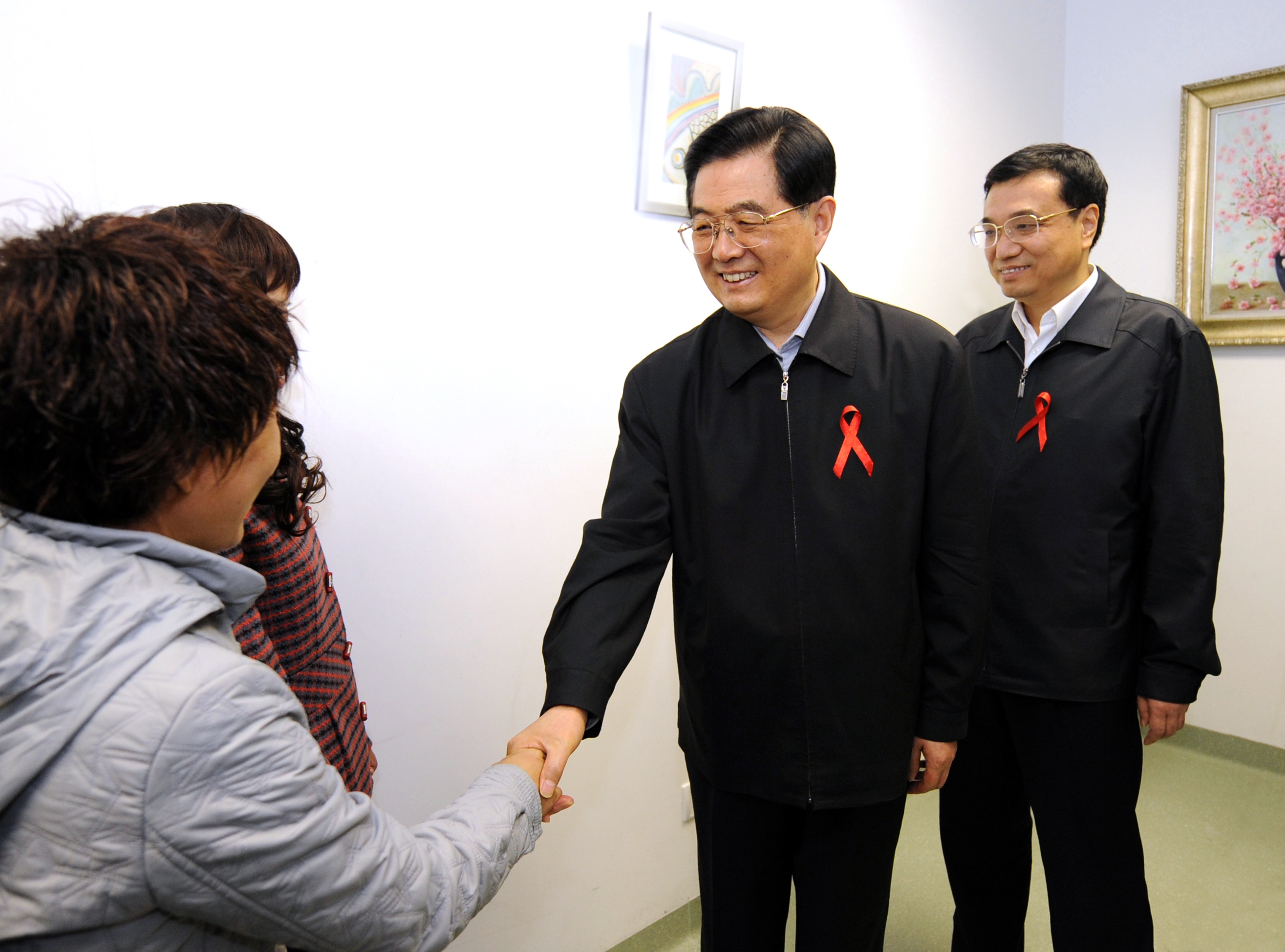 图③:2008年12月1日是第21个世界艾滋病日。胡锦涛同志和李克强同志来到北京地坛医院考察艾滋病防治工作。 (新华社记者 马占成 摄)