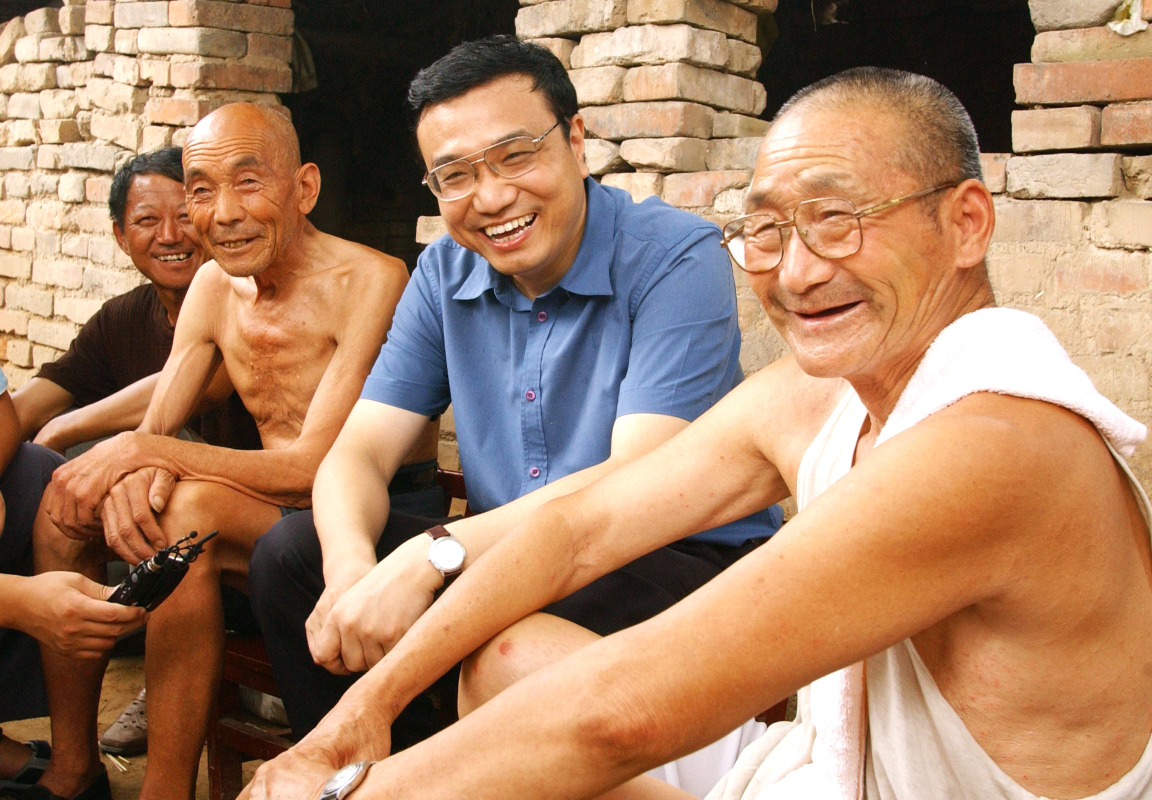 图④:2003年8月8日,李克强同志在河南省新乡市调研。这是李克强同志在原阳县桥北乡马庄村与村民亲切交谈。 新华社发(郭宇 摄)