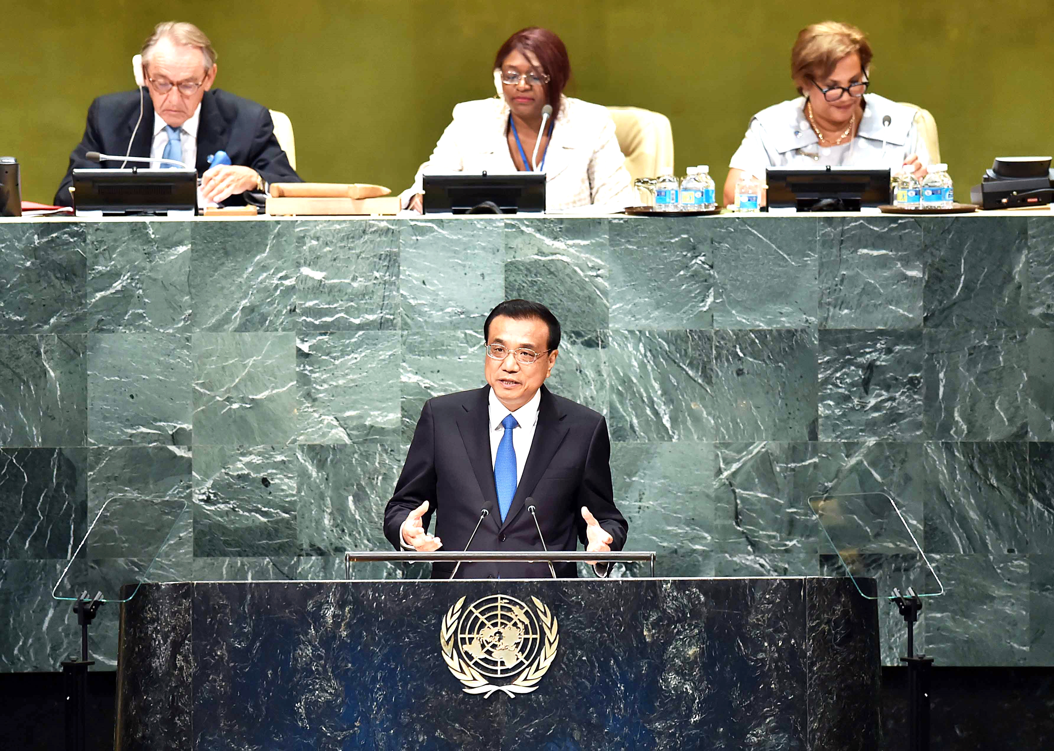 图11:2016年9月21日,李克强同志在纽约联合国总部出席第71届联合国大会以“可持续发展目标:共同努力改造我们的世界”为主题的一般性辩论并发表题为《携手建设和平稳定可持续发展的世界》的讲话。 (新华社记者 李涛 摄)
