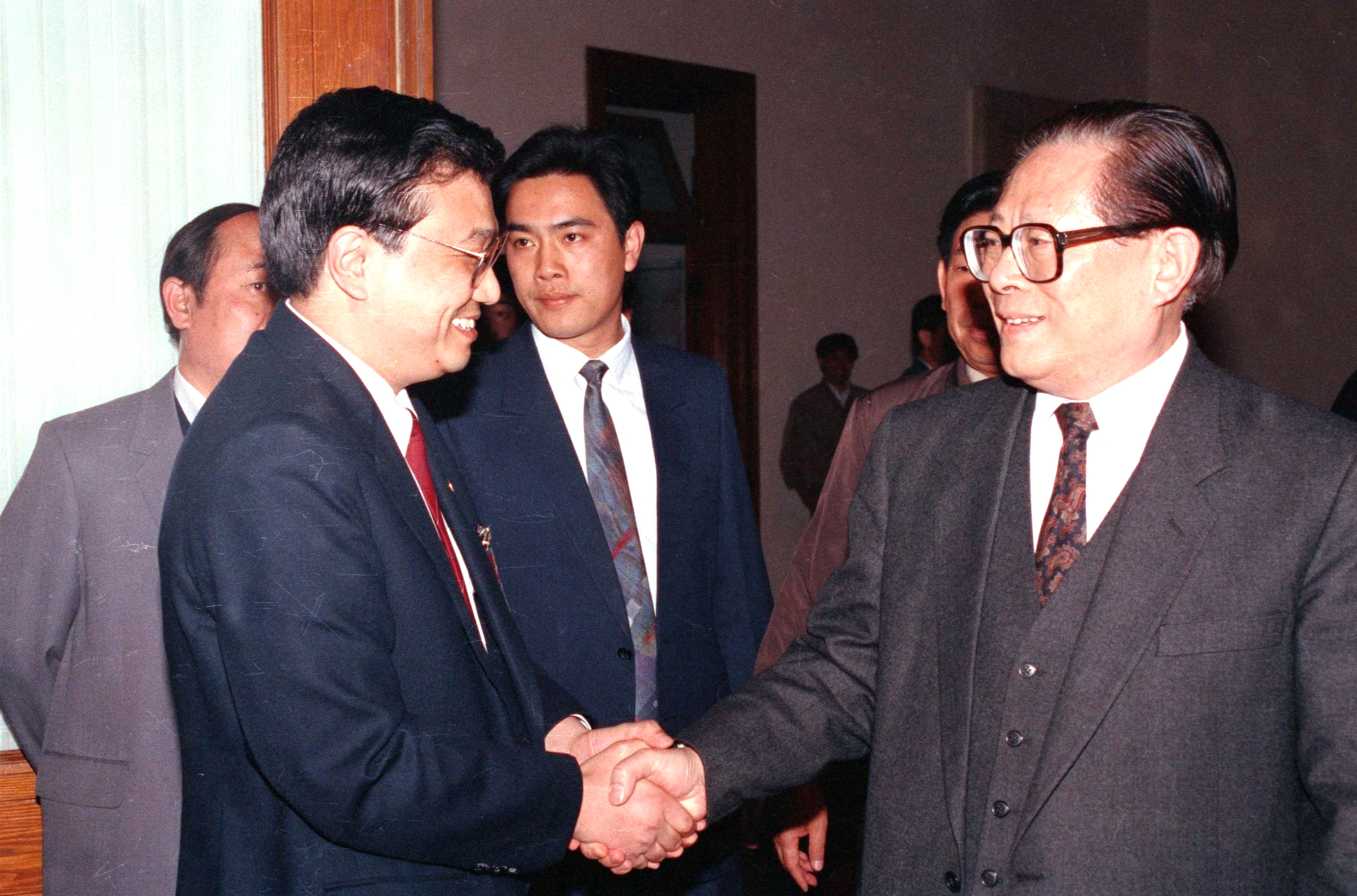 图②:1993年5月3日下午,中国共产主义青年团第十三次全国代表大会在北京人民大会堂开幕。在5月3日上午的预备会议后,举行第一次主席团会议,推选李克强等同志为主席团常务主席。这是江泽民同志与李克强同志握手。 (新华社记者 郭占英 摄)