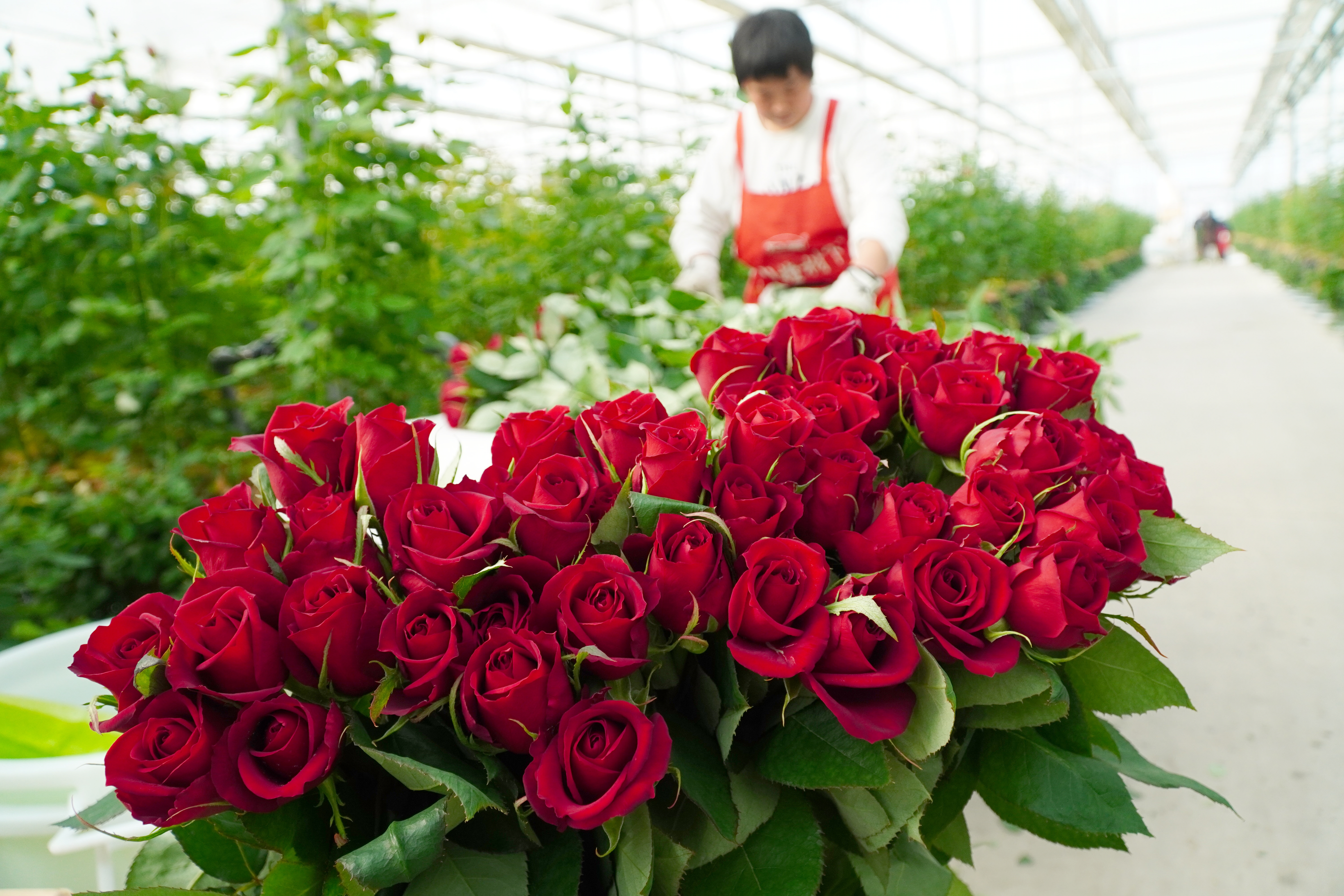 近日,山东省新泰市楼德镇的大棚玫瑰进入采摘期,花农们忙着采摘、包捆、装运玫瑰,供应鲜切花市场。近年来,当地因地制宜发展大棚玫瑰种植,目前已建成高标准、智能化玫瑰种植大棚500余亩,并完善玫瑰鲜切花加工、冷藏等配套设施。