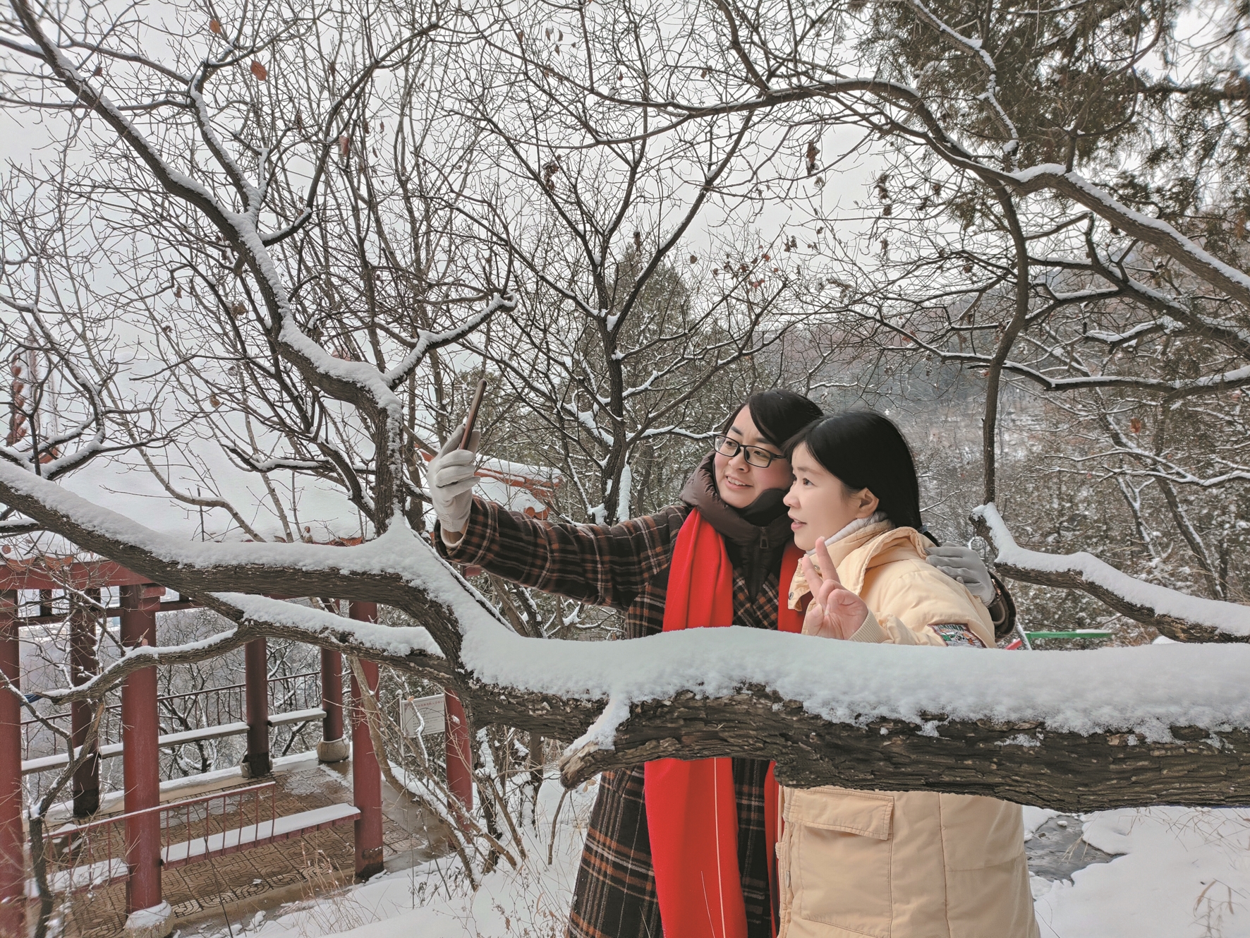 1月16日,我市喜降瑞雪,尽管降温路滑,人们出行不便,但抱犊崮风景区人气不减,很多游人及摄影爱好者竞相踏雪上山,一览雪景,拍照留念。