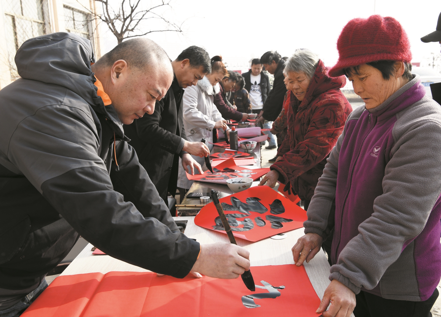 1月13日,山亭区书法志愿者在冯卯镇望母山村义务为村民书写春联和福字门贴。当日,山亭区文联组织部分书法志愿者来到冯卯镇望母山村,免费为村民现场书写春联、送福字,迎接即将到来的农历新年,受到群众的欢迎。 (记者 王龙飞 通讯员 李宗宪 摄)