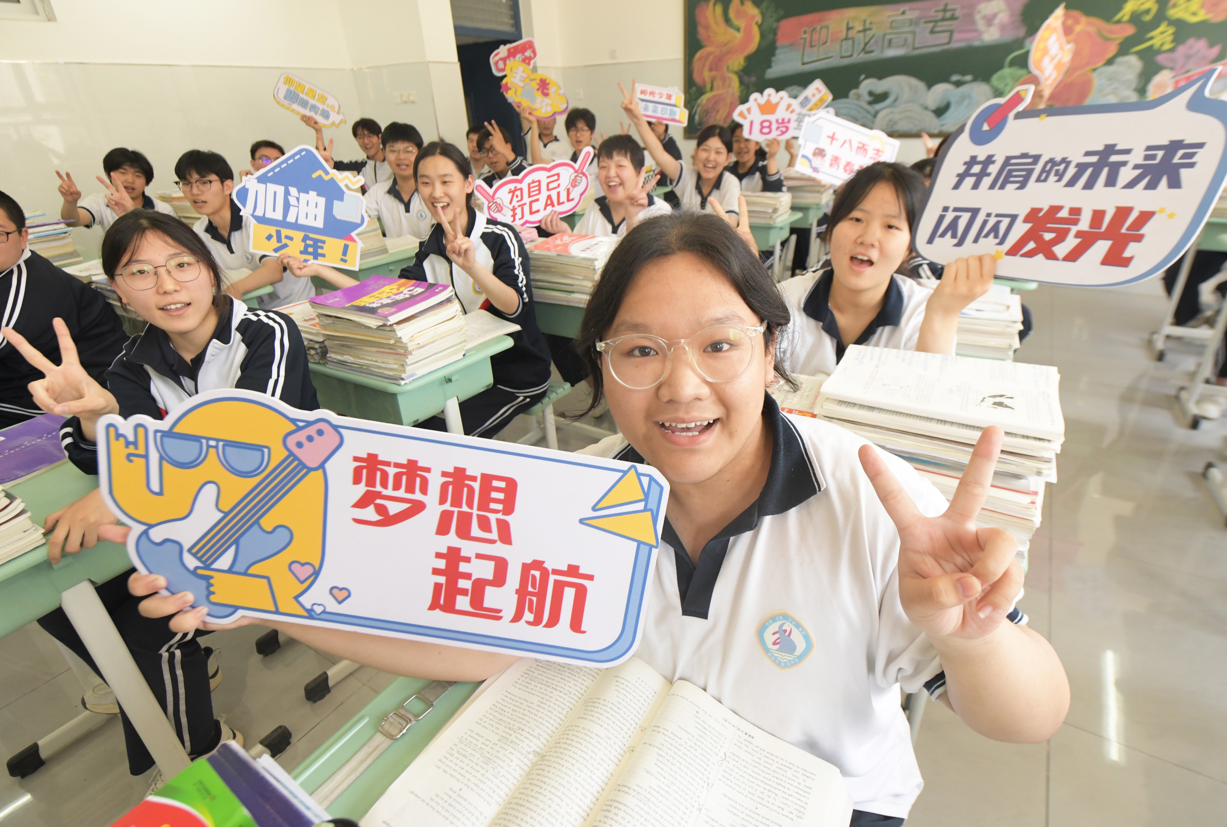 5月14日,河北省石家庄新乐市第四中学高三的学生在教室为自己加油鼓劲。