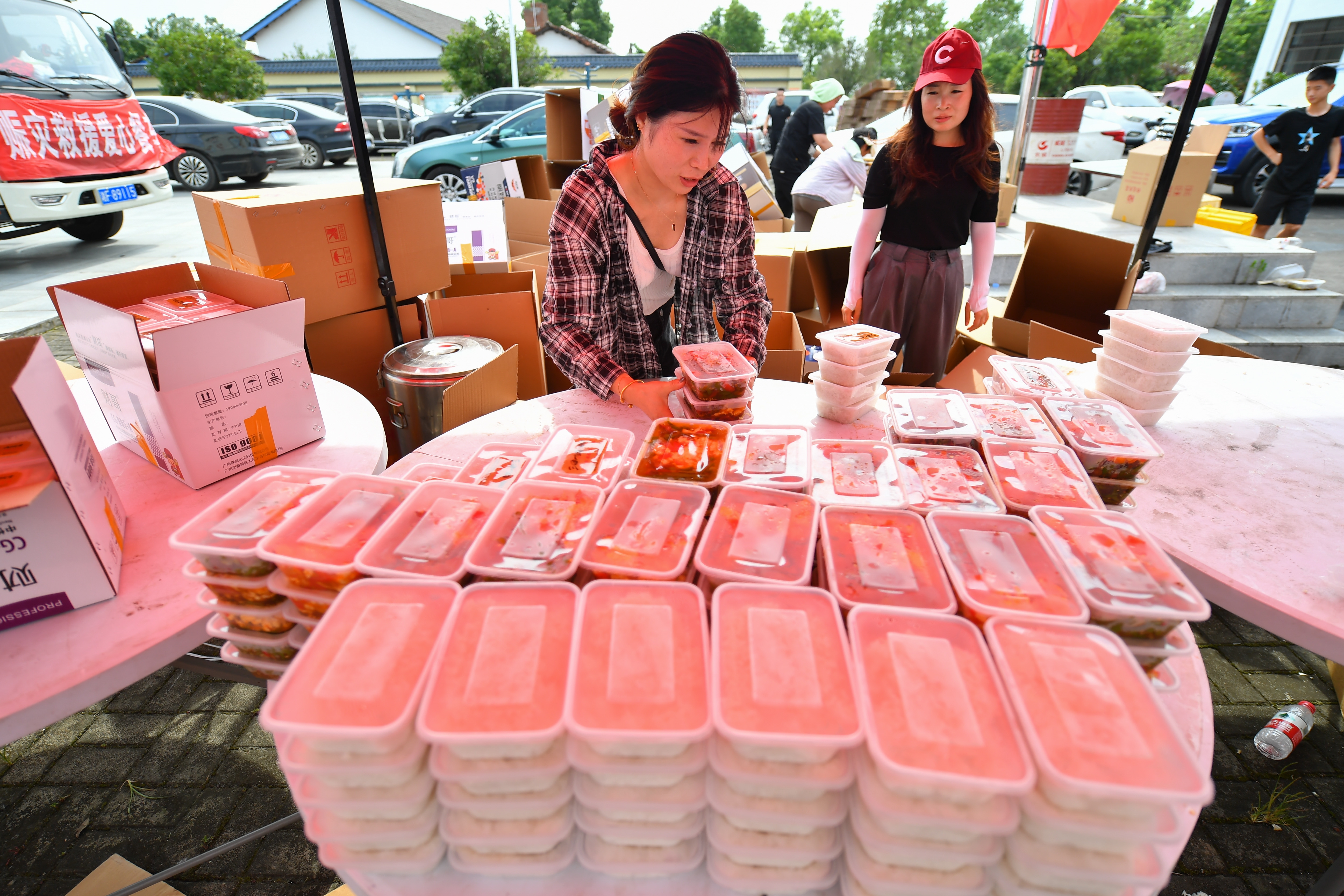 在岳阳市良心堡镇望君洲村,志愿者在整理盒饭(7月8日摄)。