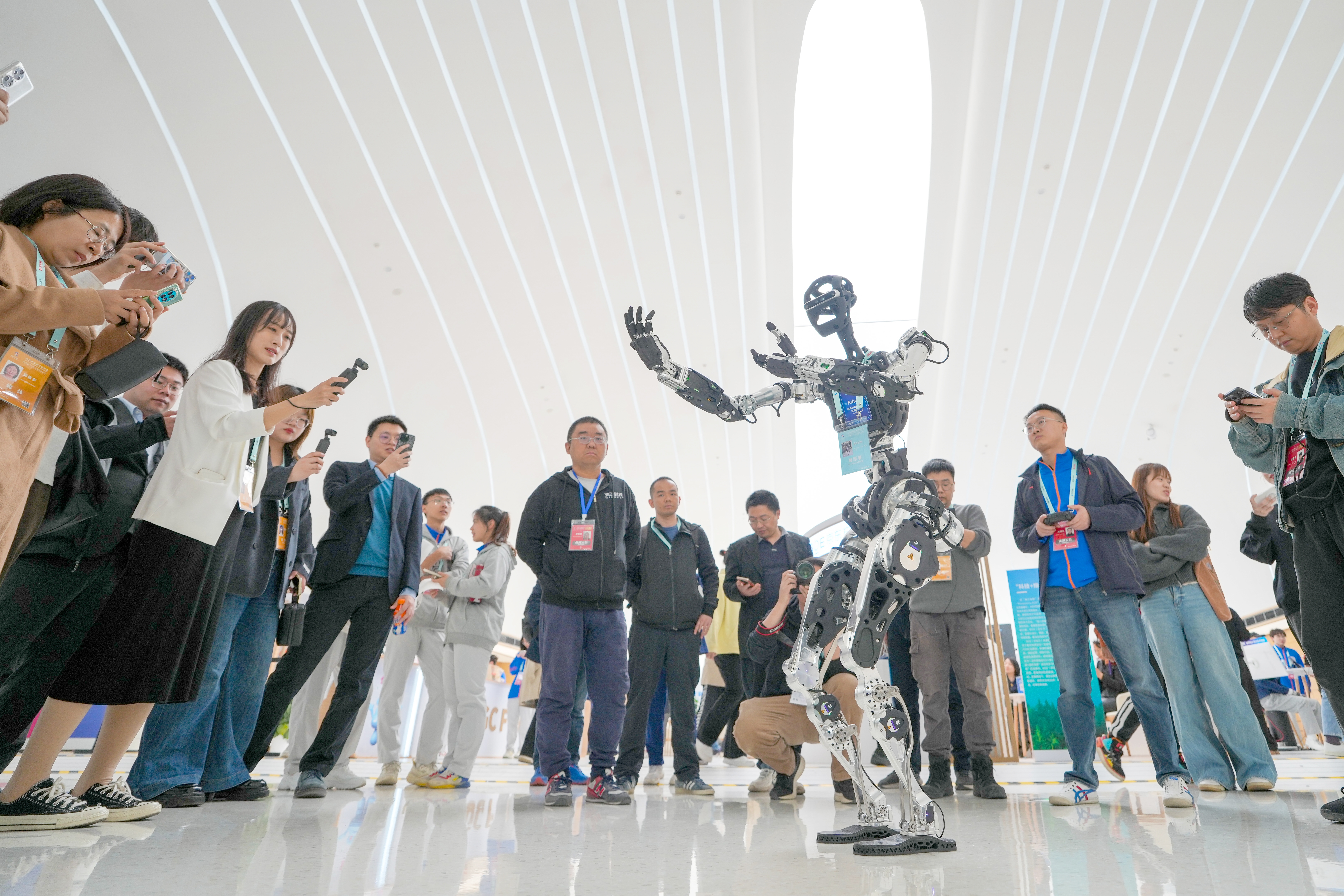2025年3月27日,在中关村国际创新中心,与会嘉宾和记者在观看一款名为“Adam”的人形机器人表演太极拳。 (新华社记者 鞠焕宗 摄)