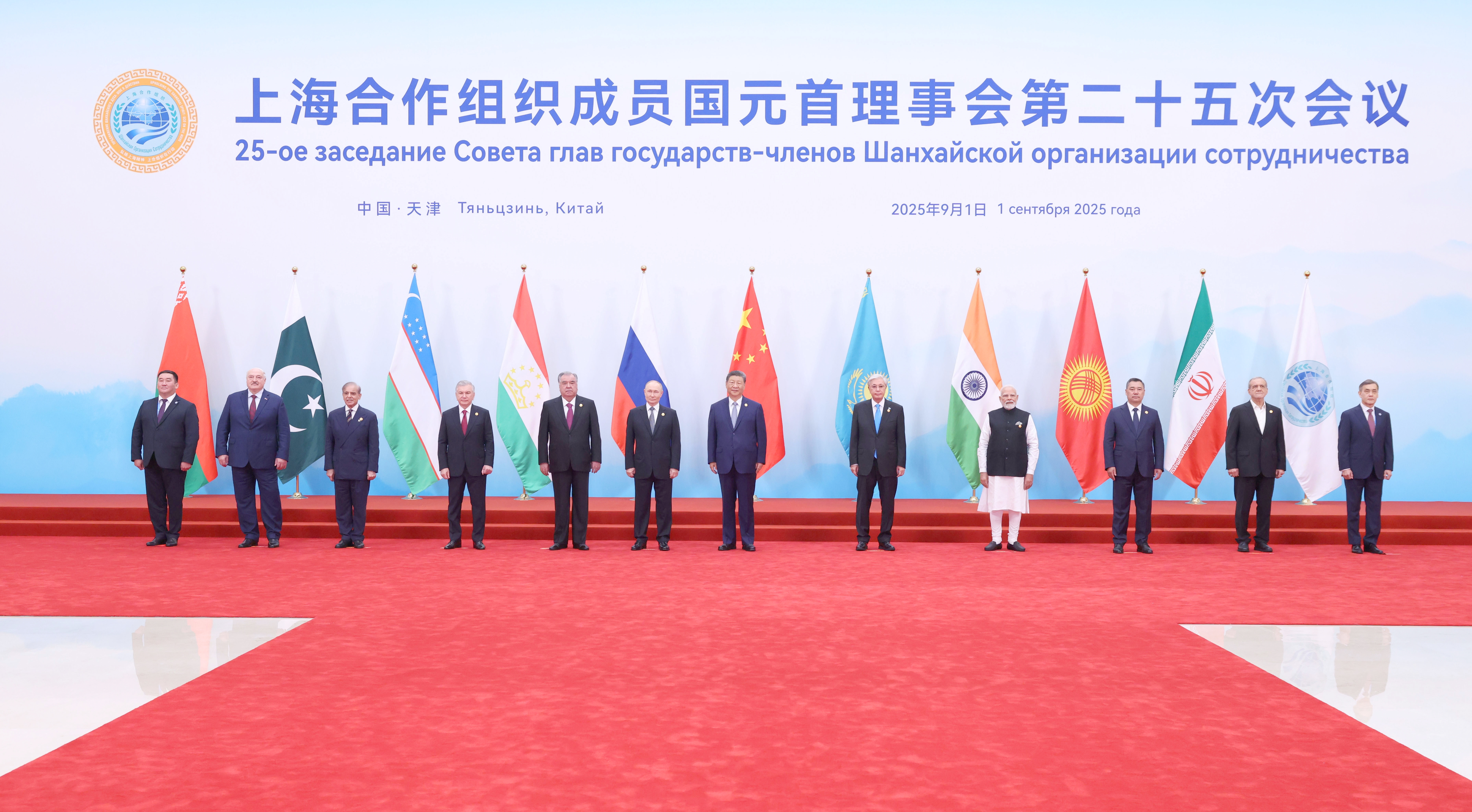 9月1日上午,上海合作组织成员国元首理事会第二十五次会议在天津梅江会展中心举行。中国国家主席习近平主持会议并发表题为《牢记初心使命 开创美好未来》的重要讲话。这是习近平同出席会议的上海合作组织成员国领导人、常设机构负责人集体合影。 (新华社记者 黄敬文 摄)