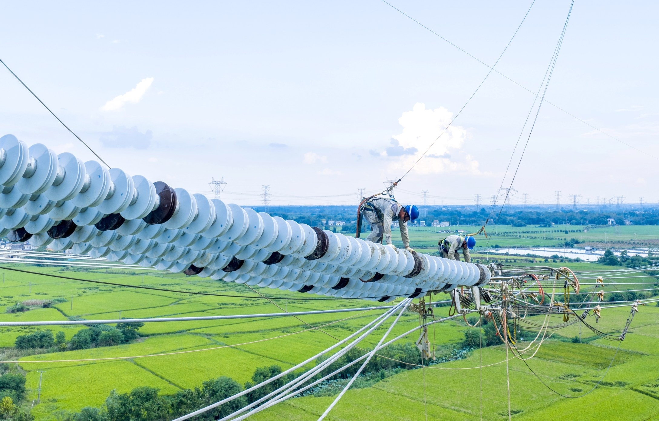 在安徽省芜湖市南陵县,安徽送变电工程有限公司施工人员在高空进行架线施工(9月16日摄,无人机照片)。