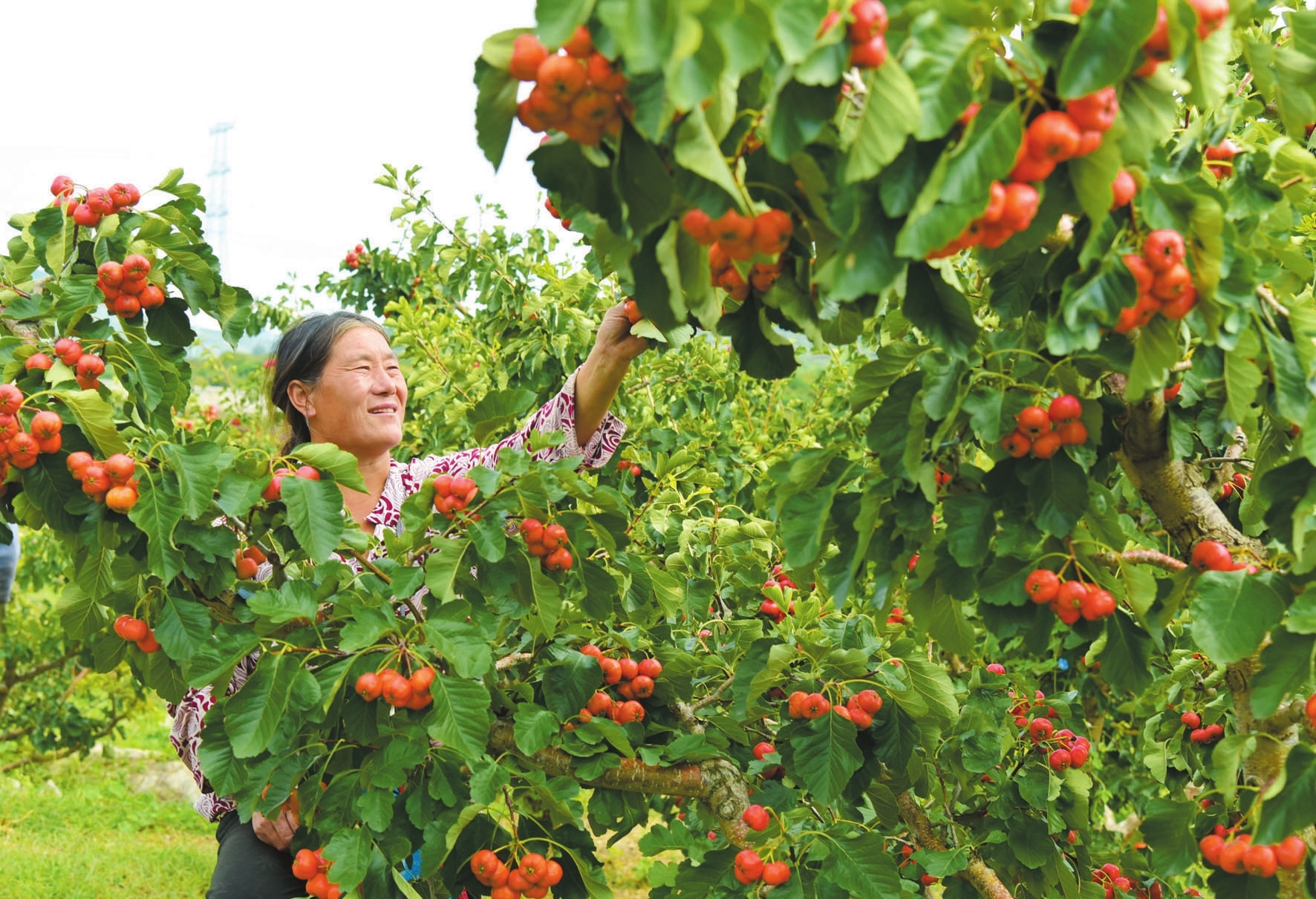 9月21日,山亭区水泉镇长城村农民在果园采摘山楂。