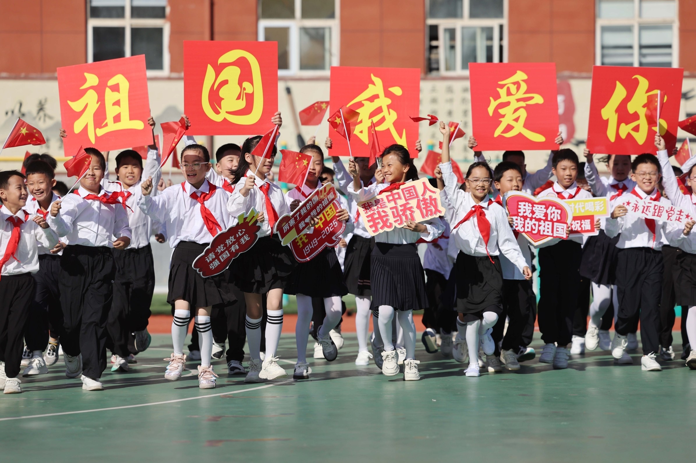 右图:9月25日,在山东省临沂市沂南县,第三实验小学的小学生们参加“祝福祖国”活动。