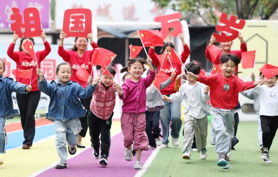 9月26日,山东省临沂市郯城县郯城街道官塘幼儿园的老师和孩子进行课间“快乐跑”。