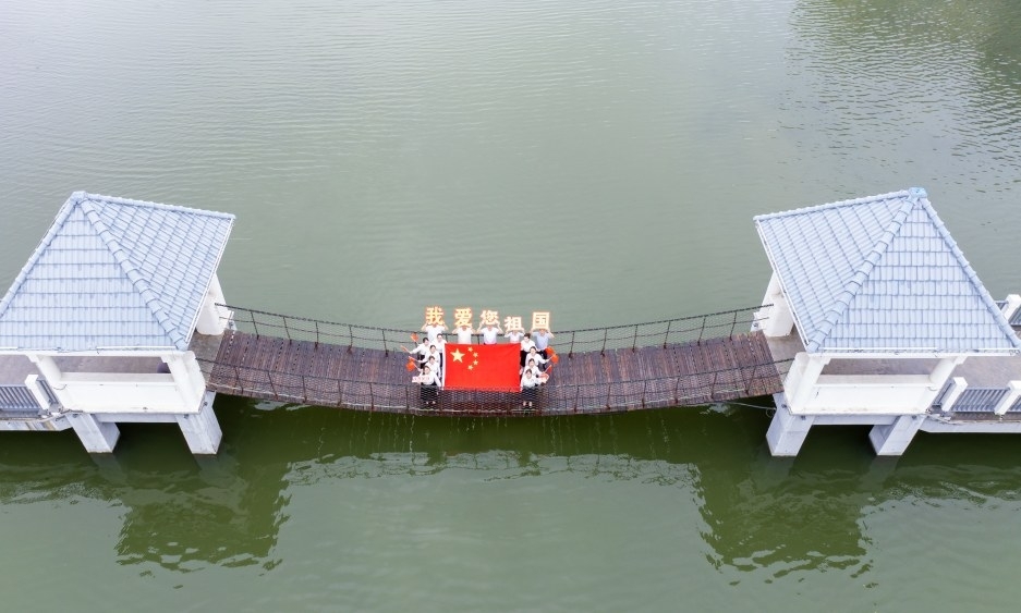 9月26日,江苏省兴化市自然资源和规划局工作人员参加“我和国旗合个影”主题活动(无人机照片)。