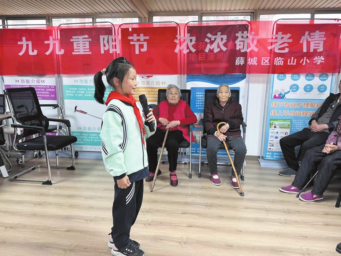 重阳佳节,薛城区临山小学的同学们走进敬老院,用自编自演的精彩节目向老人传递欢乐,弘扬尊老敬老美德。