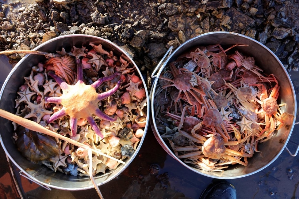 记者搭乘“雪龙2”号在北极楚科奇海北部海域目睹14个站位的底拖网作业,看到每个站位获取的生物样品种类和数量各不相同,其中海星、雪蟹、海鳃、海葵以及管栖多毛类是作业海域的优势动物。