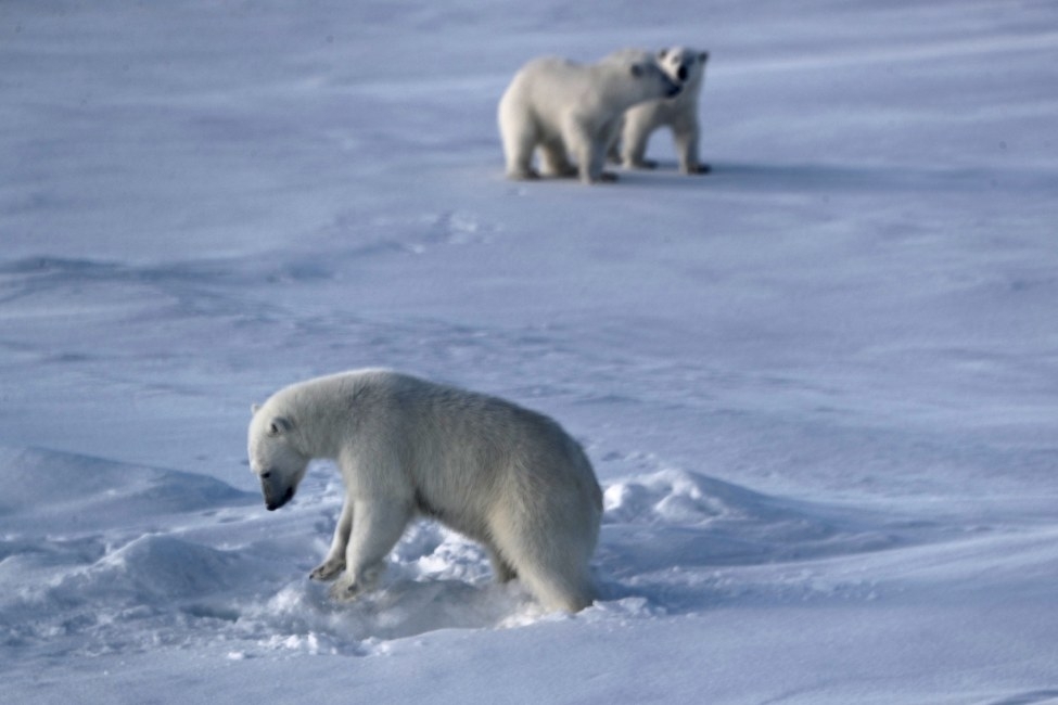 2025年8月31日在北冰洋高纬度地区拍摄的北极熊一家三口。 (新华社记者 刘诗平 摄)
