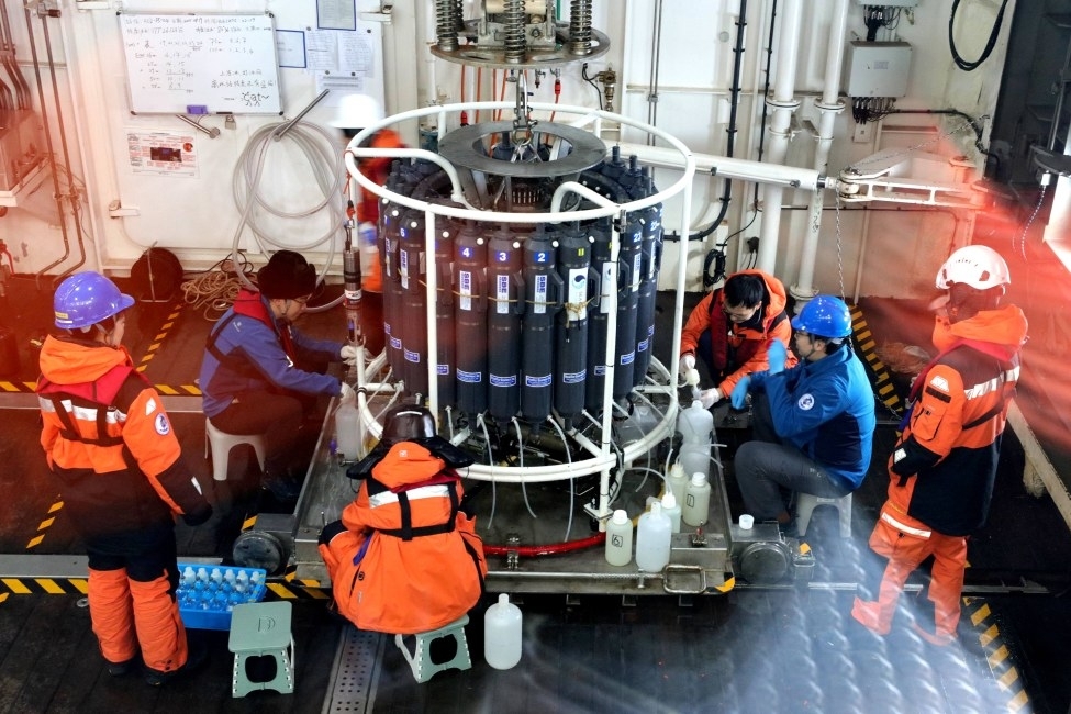 2025年8月19日,科考队员在采集CTD(温盐深剖面仪)带回的水样品。 (新华社记者 刘诗平 摄)