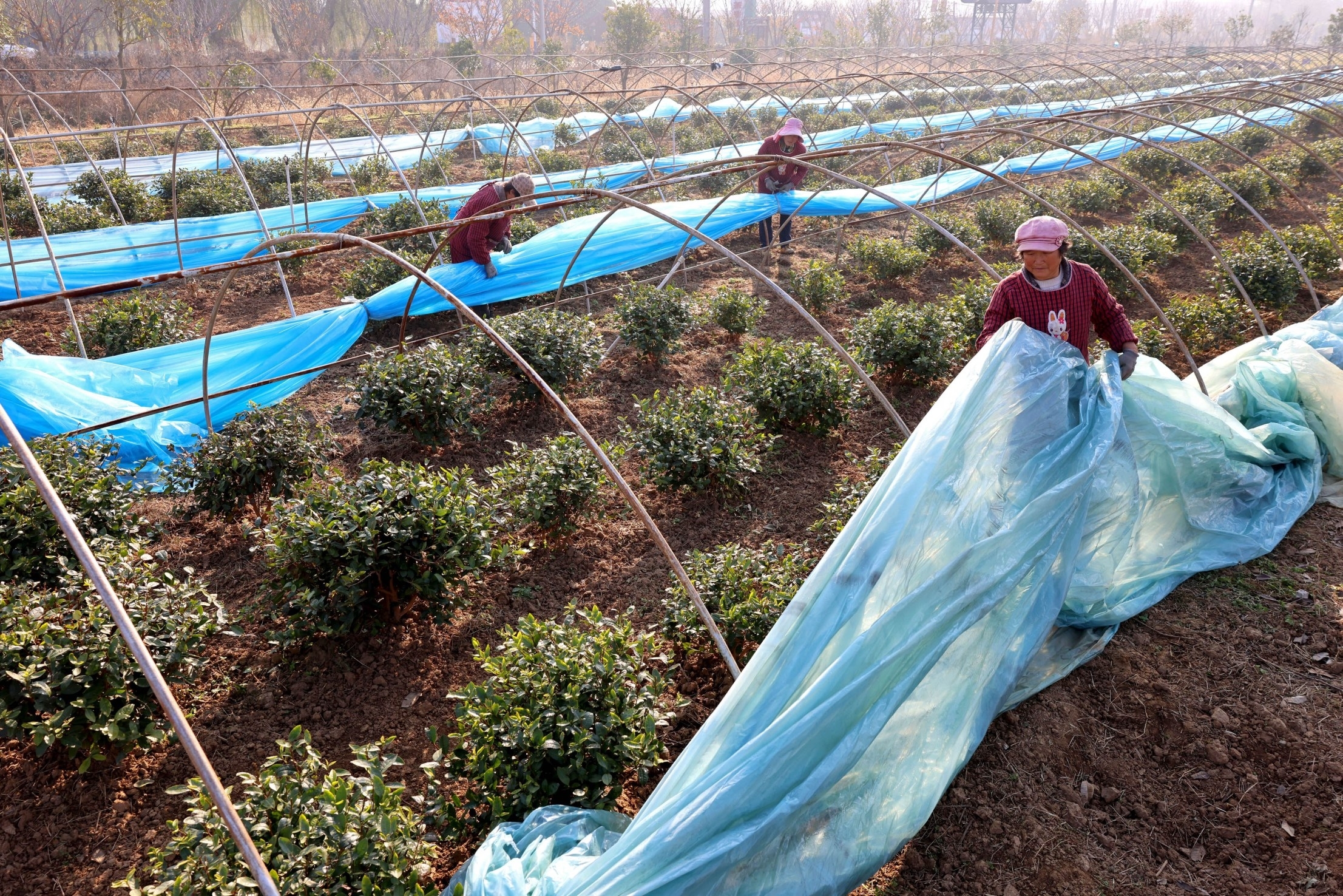 图为:11月21日,在市中区孟庄镇大郭庄村茶园,农民在为茶树盖膜保温抵御风寒。