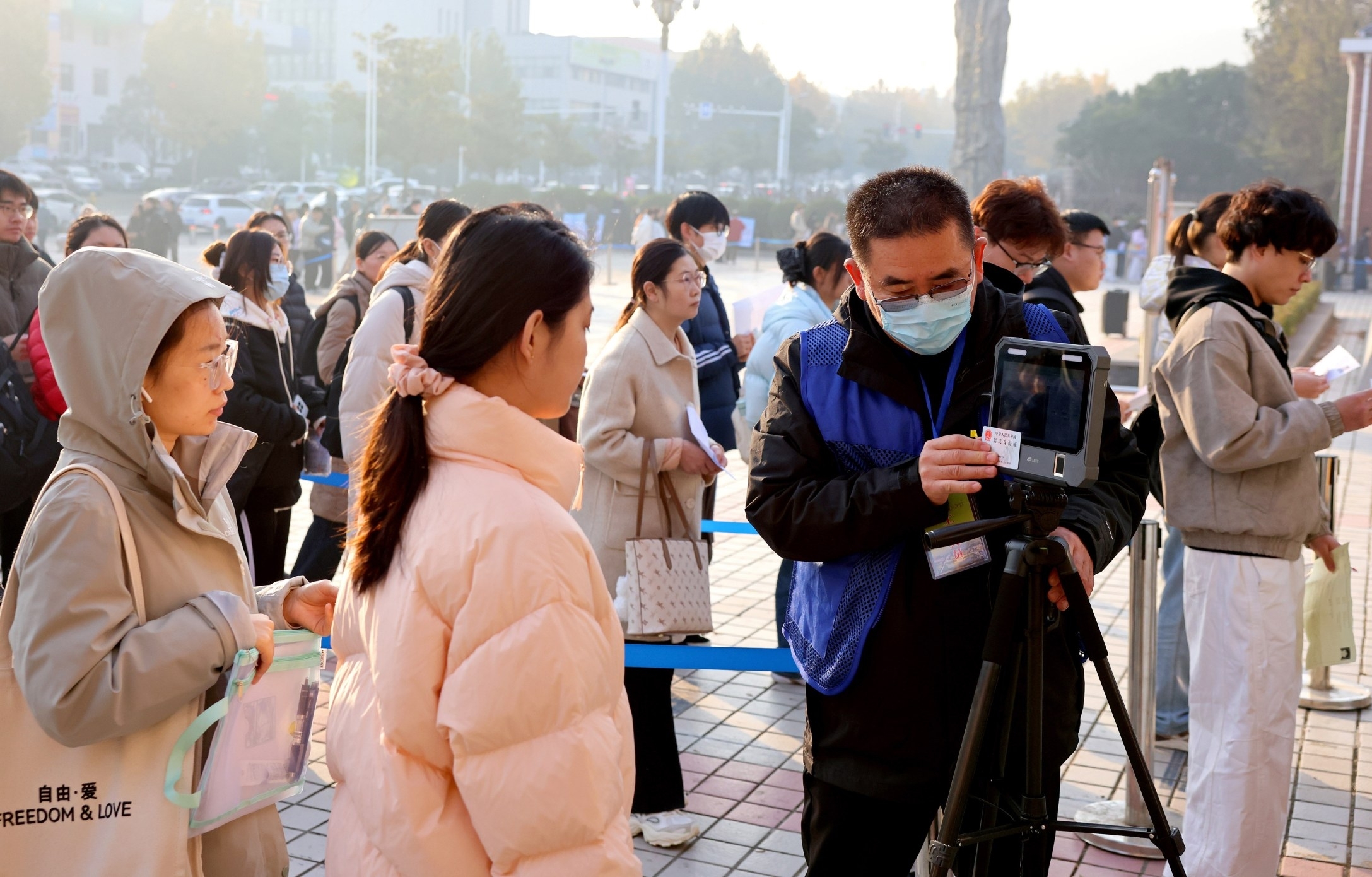 11月30日,在枣庄市实验学校考点,工作人员在核对考生信息。