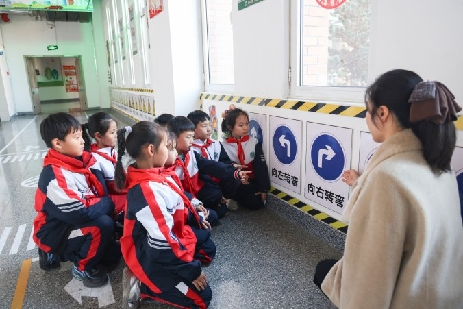 左图:12月1日,薛城区龙潭实验学校学生在校园交通角,学习辨认交通标识。(记者 王溯 通讯员 姜晓娟 摄)
