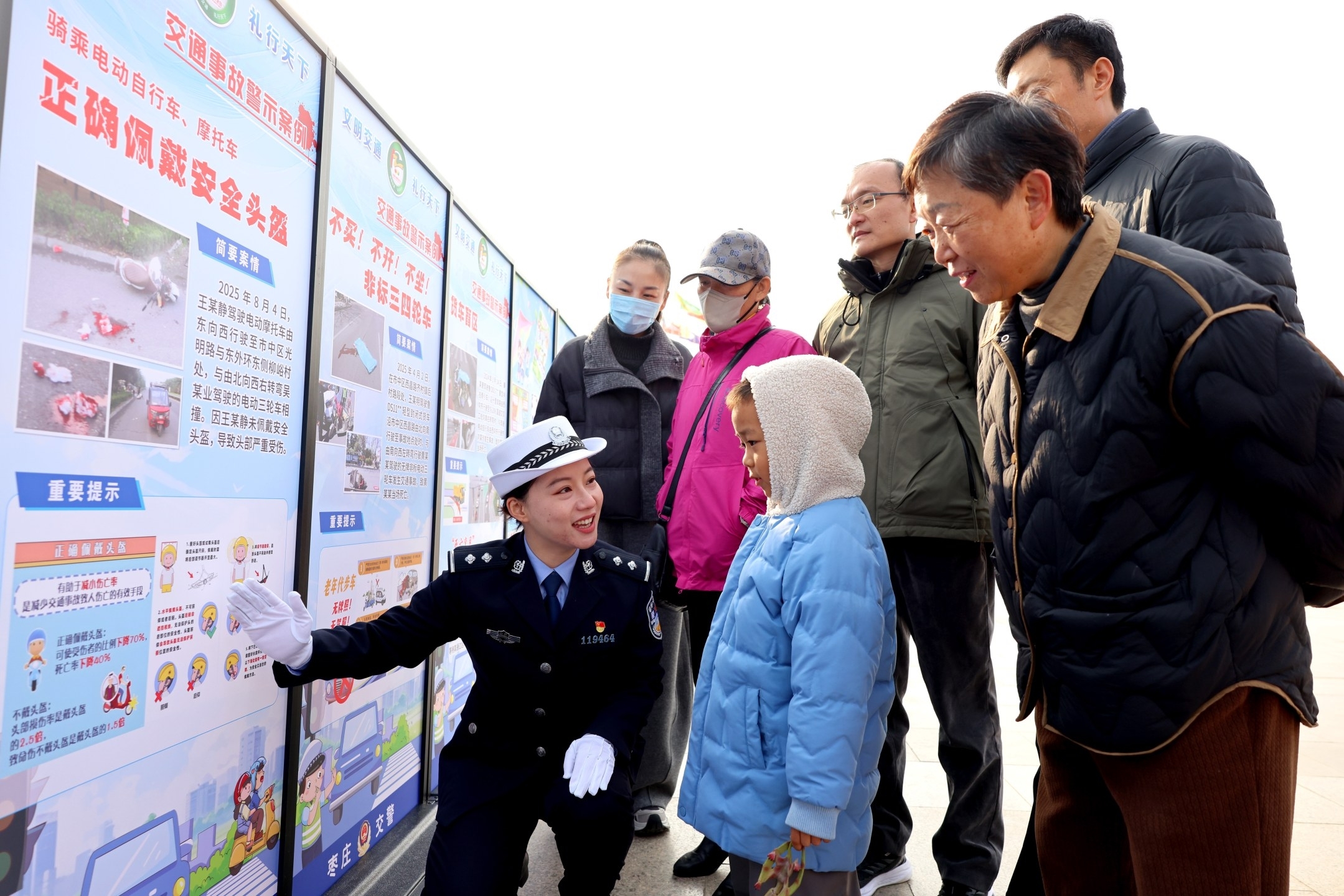 右图:12月2日,民警在光明广场向人们宣传交通安全知识。(吉喆 张伟 摄)