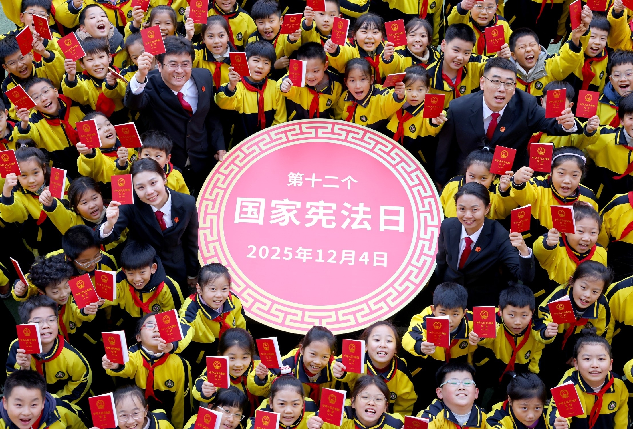 右图:12月3日,市中区人民法院的法官在文化路小学与学生一起共同为宪法“庆生”。 (吉喆 张树茂 摄)