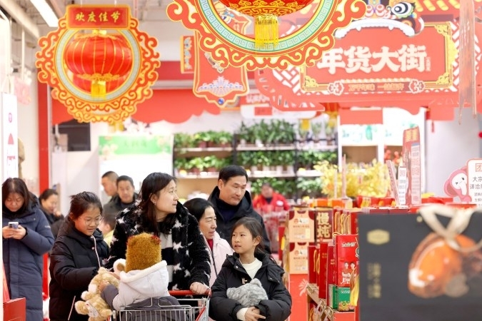 上图:1月24日,人们在一家超市里的“年货大街”选购年货。