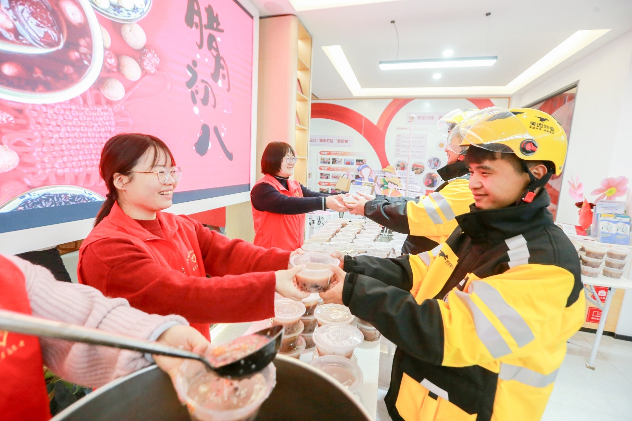 1月26日,在江苏省扬州市徐凝门街社区,志愿者为外卖员送上腊八粥。
