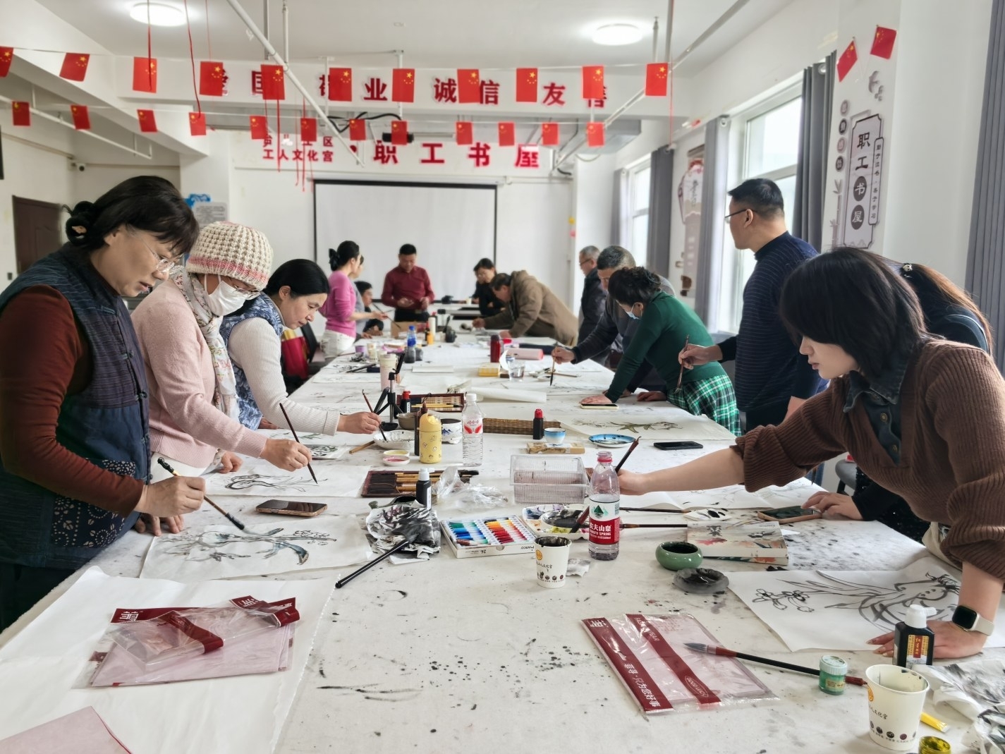 2月1日,台儿庄区书画公益培训课在区工人文化宫举行,30多名书画爱好者与书画家一起挥毫创作,以国画、春联等形式推动传统书画技艺代代相传,彰显传统文化的生命力。 (记者 岳娜 通讯员 张体健 摄)