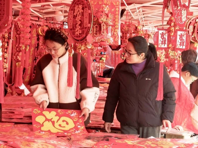 上图:2月13日,市民在薛城区古路街年货市场挑选“福”字。