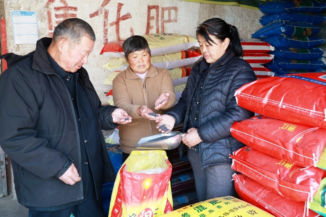 2月19日,在山亭区凫城镇一农资销售点,农民在选购农资。