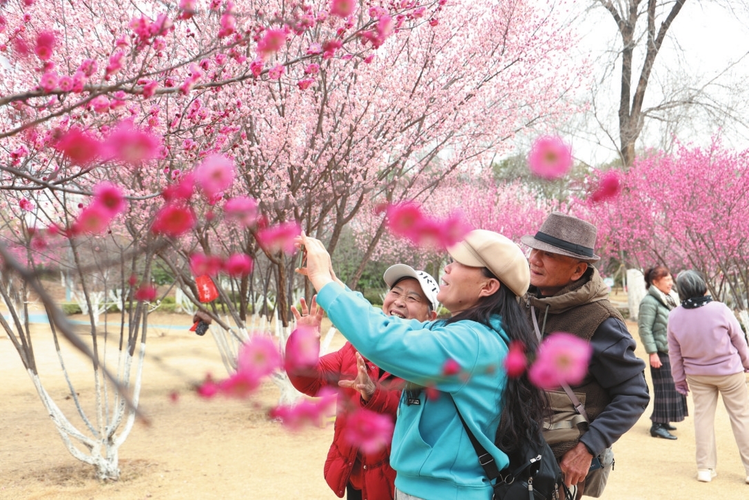 连日来,随着气温陆续回暖,枣庄光明广场西南角的大片梅花迎来集中绽放期,枝头缀满绯红花蕾,如霞似锦,吸引众多市民游客前来赴这场“梅”好之约。图为市民游客在赏花拍照游玩。