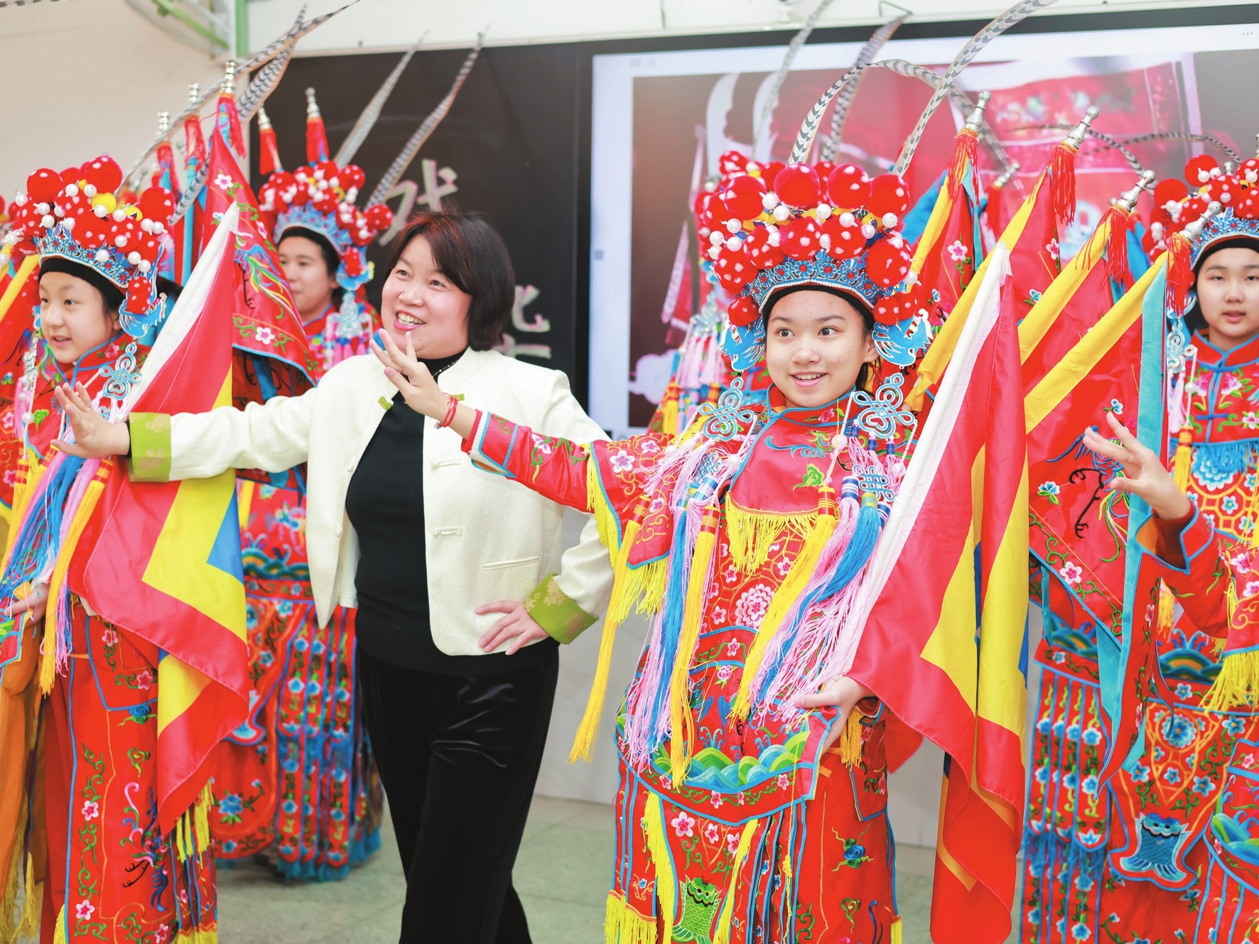图为:在薛城区双语实验小学,戏曲社团老师给学生上戏曲课。 (记者 王龙飞 摄)