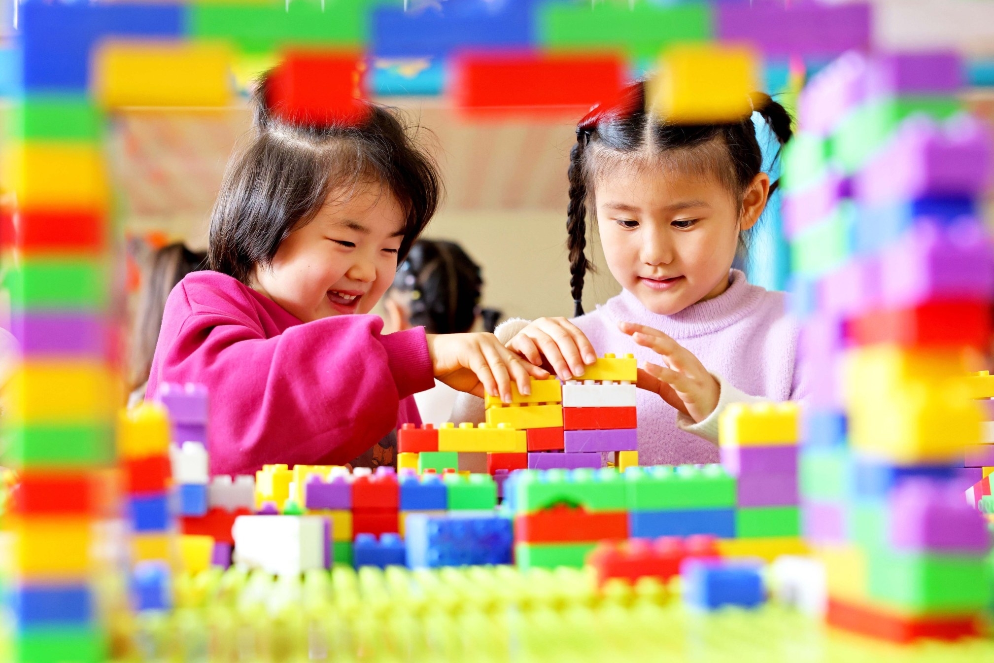 2025年11月6日,在山东省枣庄市市中区西王庄镇中心幼儿园,托育班的小朋友在拼搭积木。新华社发(孙中喆 摄)