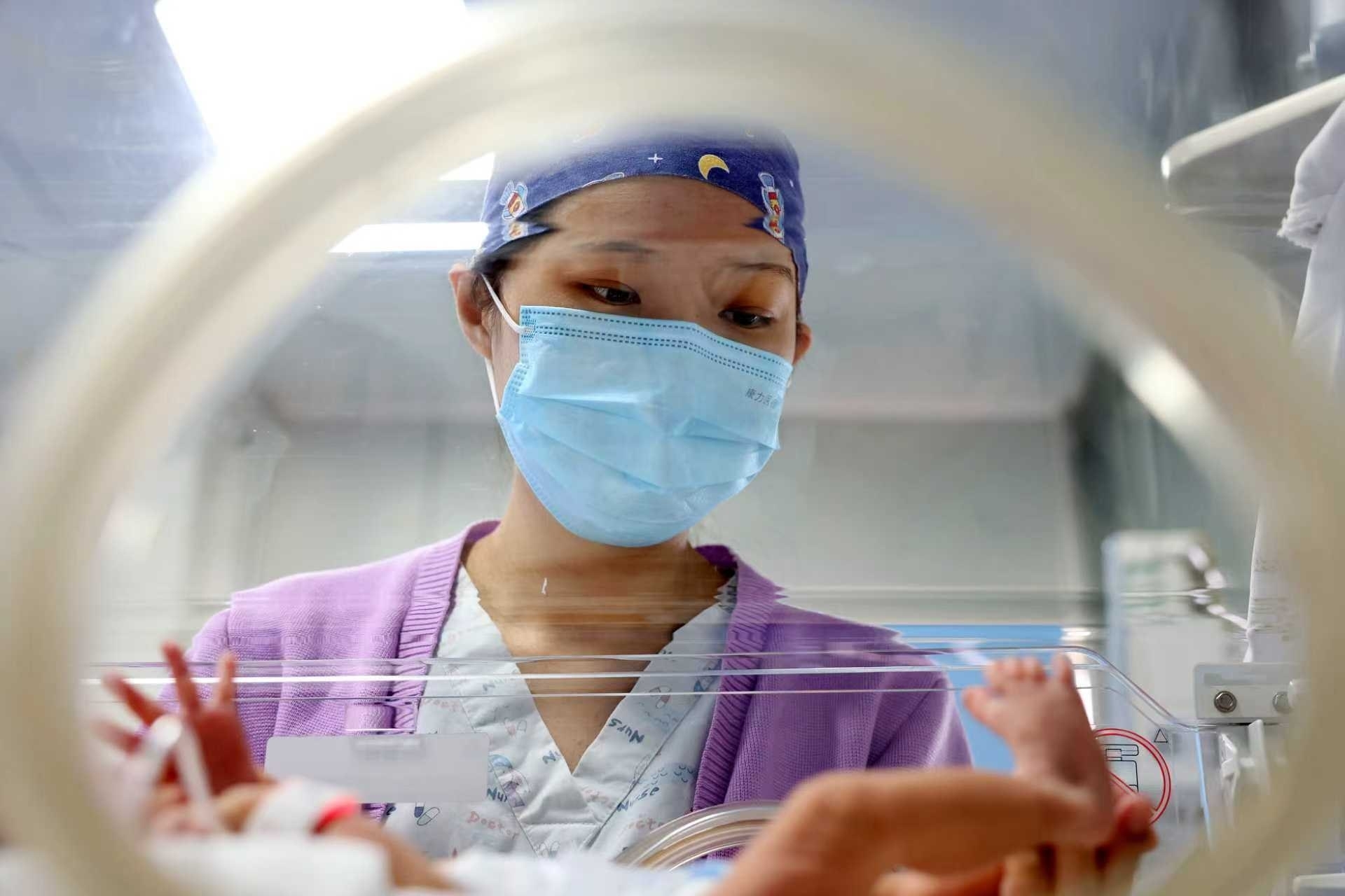 图为:市妇幼保健院的医务人员在对新生儿进行护理。